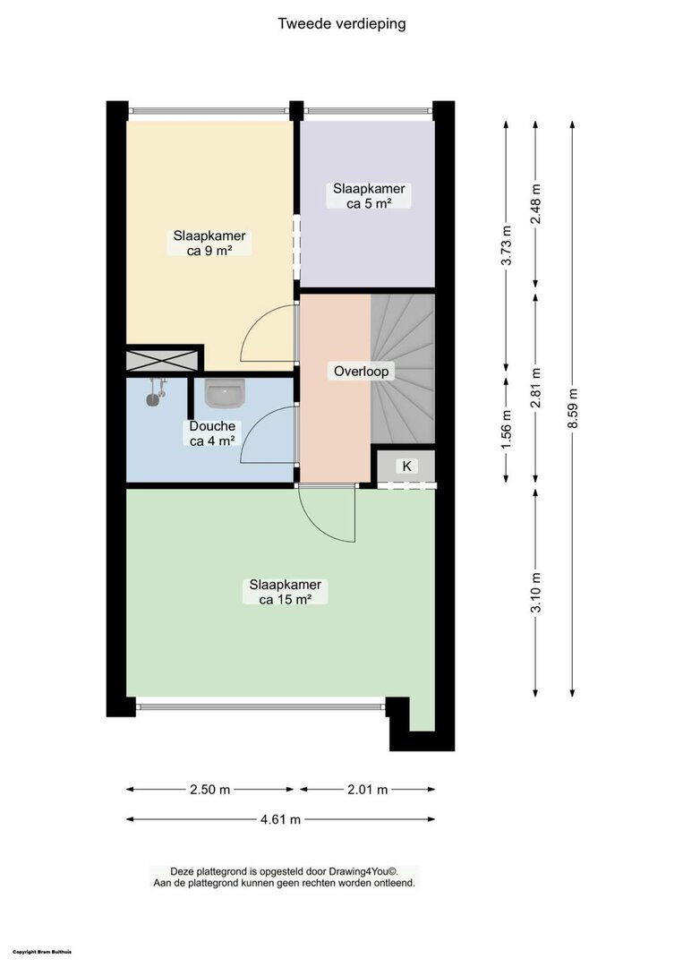 Overloop met toegang tot drie slaapkamers van respectievelijk 5, 9 en 15m², de kleinste kamer is in gebruik als kastenkamer, zoals is te zien op de plattegrond. Tevens badkamer met douchegelegenheid en wastafel.