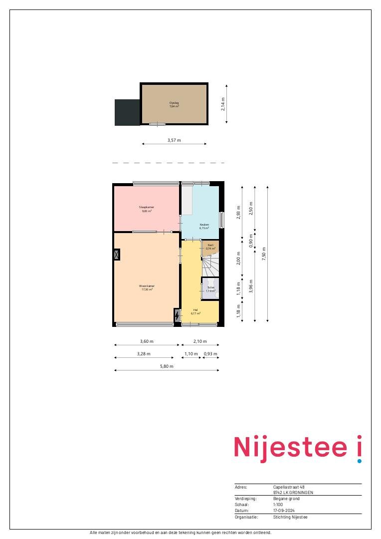Entree/hal met toegang tot het separate toilet (circa 1 m²), trapopgang en trapkast. Vanuit de hal heeft u tevens toegang tot de open woonkamer (circa 26 m²) en dichte keuken (circa 6 m²) voorzien van eenvoudig keukenblok. Vanuit de keuken bereikt u de tuin op het westen en de vrijstaande stenen berging.