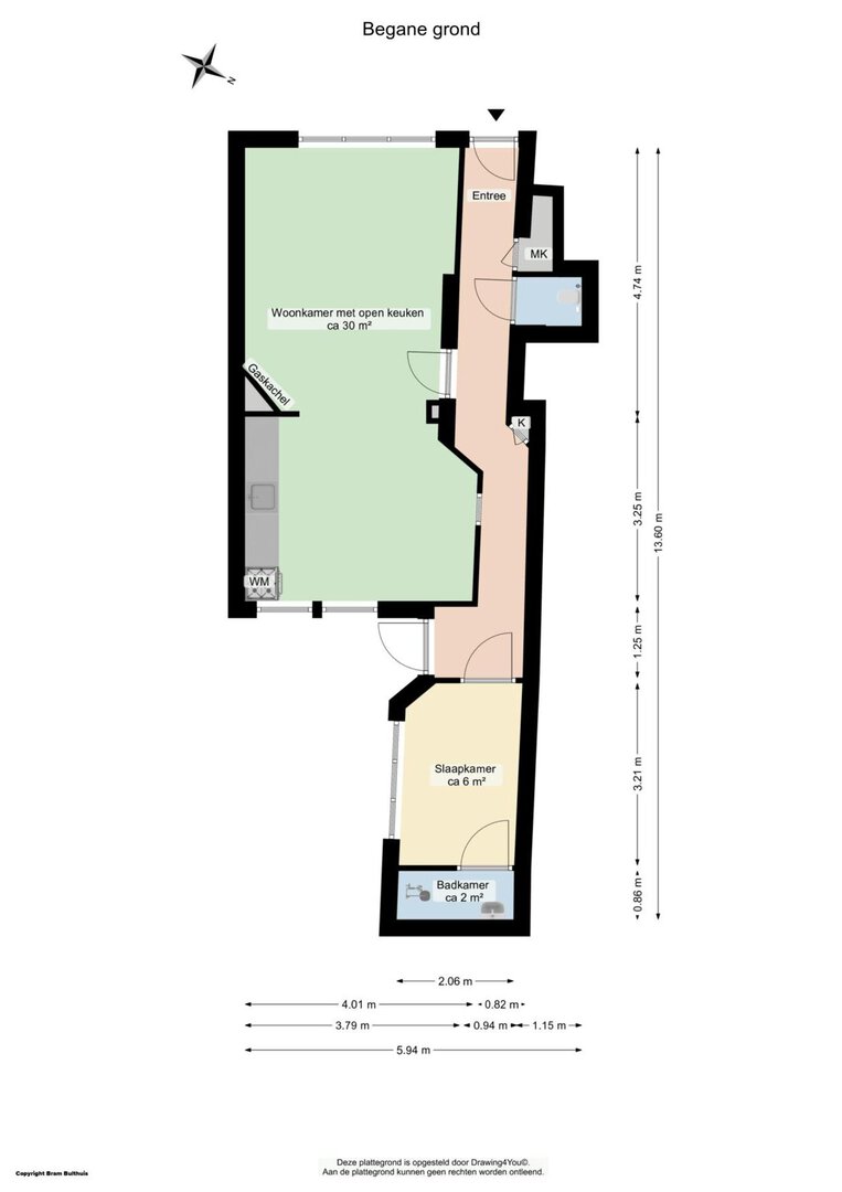 Entree - gang - toilet (zwevend) - inbouwkast - sfeervolle woonkamer circa 30m² met schouw, laminaatvloer en open keuken met eenvoudige keukeninrichting inclusief een wasmachine aansluiting - vanuit de gang toegang tot een slaapkamer circa 6m² met deur naar de verzorgde badkamer met douche en wastafel.