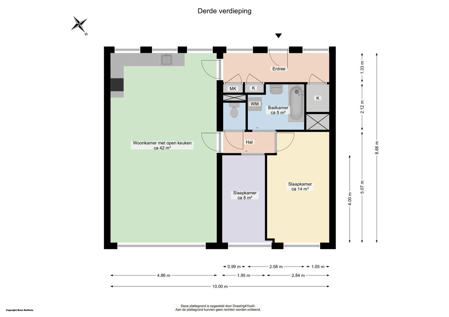 Entree - hal met technische ruimte - woonkamer circa 42m² met eiken lamelparketvloer - open keuken met fraaie keukeninrichting o.a. voorzien van vaatwasmachine, vriezer, koelkast, combioven, 4-pits inductiekookplaat - tussenhal - toilet met hangend closet - 2 slaapkamers circa 8 en 14m² met laminaatvloer - badkamer in lichte kleurstelling circa 5m² met ligbad/douche, wastafel, handdoekradiator en wasmachine aansluiting.