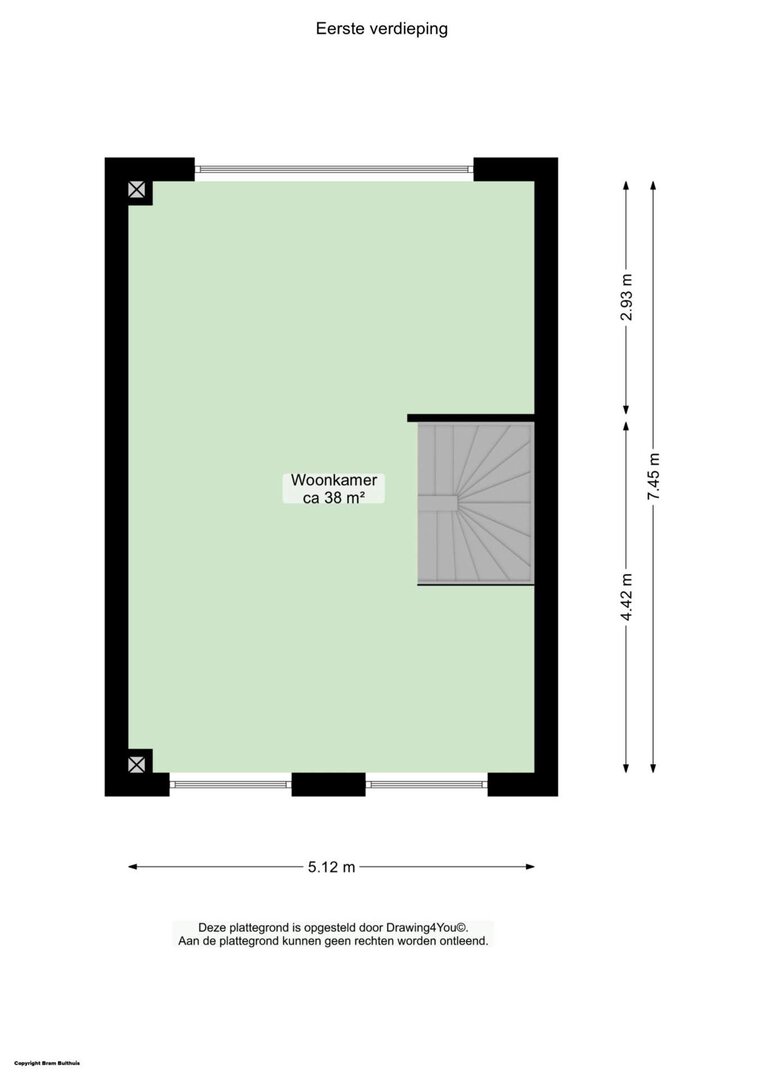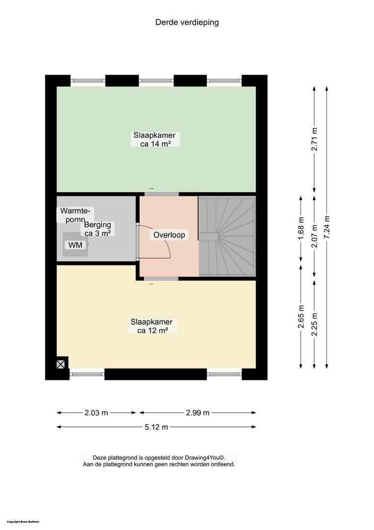 overloop met daaraan twee slaapkamers (ca. 12 en 14 m²) en berging met aansluiting voor de wasmachine en stookruimte.