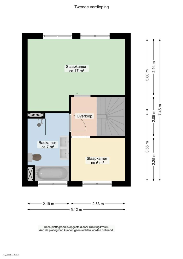 overloop met daaraan twee slaapkamers (ca. 6 en 17 m²) en de moderne badkamer voorzien van ligbad, inloopdouche, dubbele wastafel en 2e toilet.