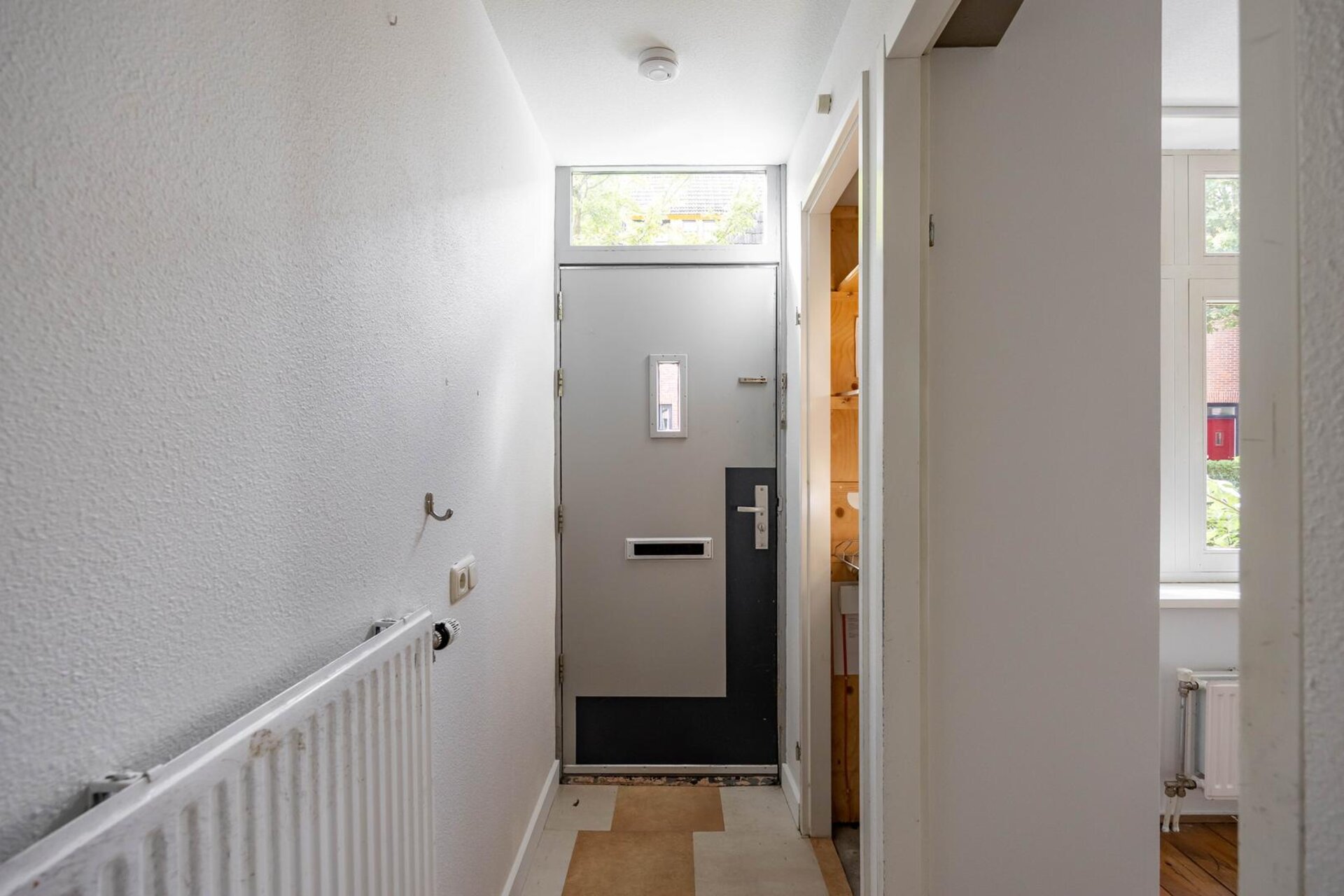 Entree/hal met trapopgang en meterkast en toegang tot de open woonkamer. De woonkamer is circa 18 m² en biedt toegang tot de keuken (ca. 16 m²). De keuken is voorzien van een eenvoudig keukenblok en geeft toegang tot de tuin op het oosten.