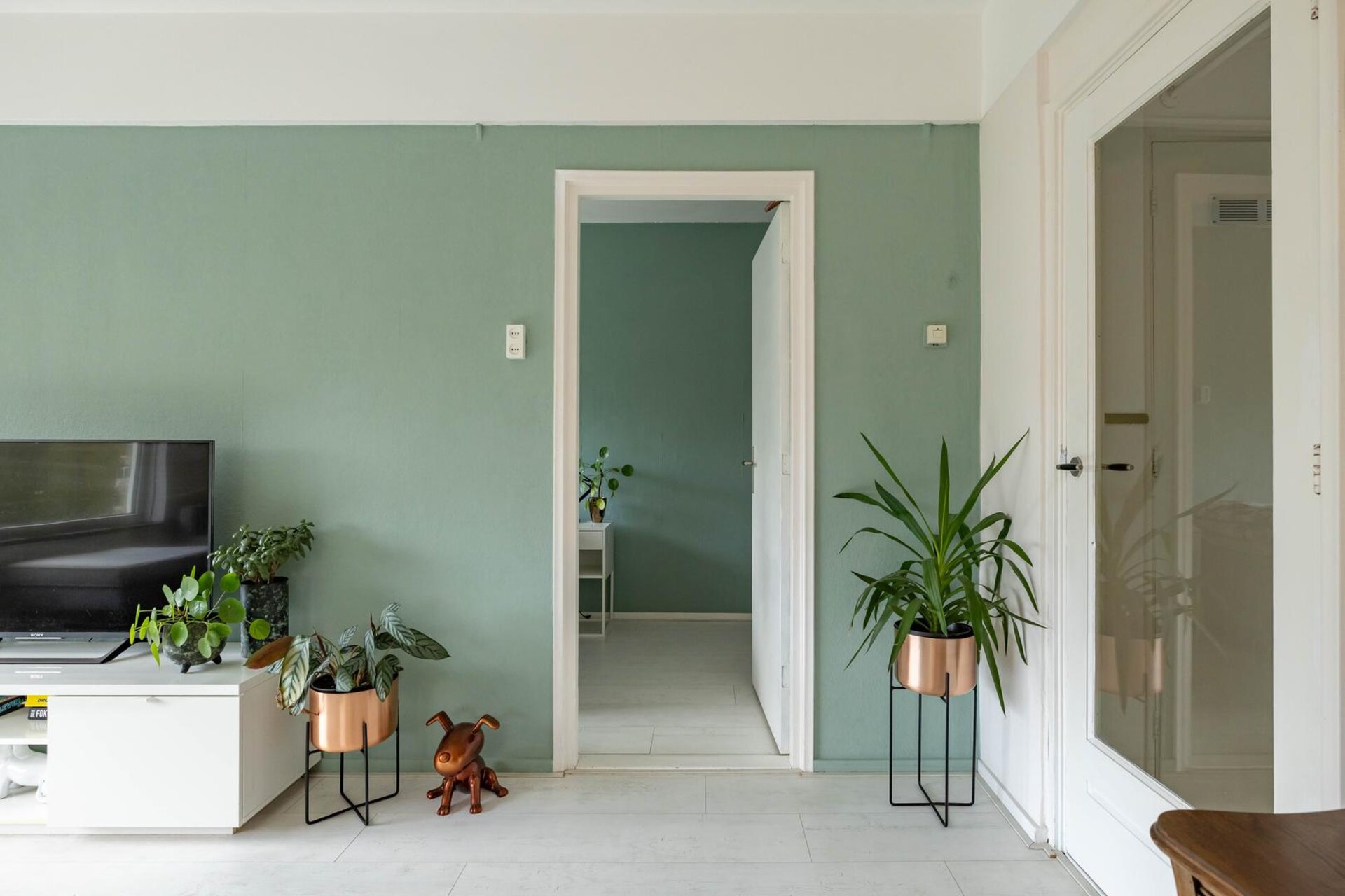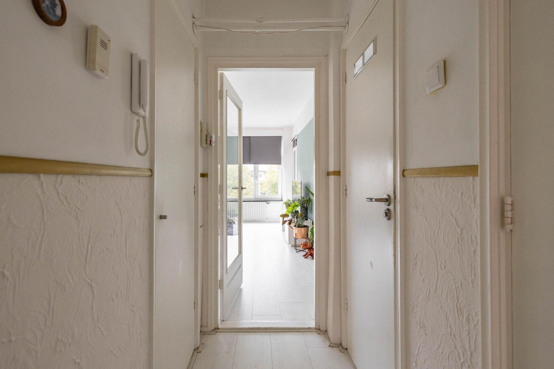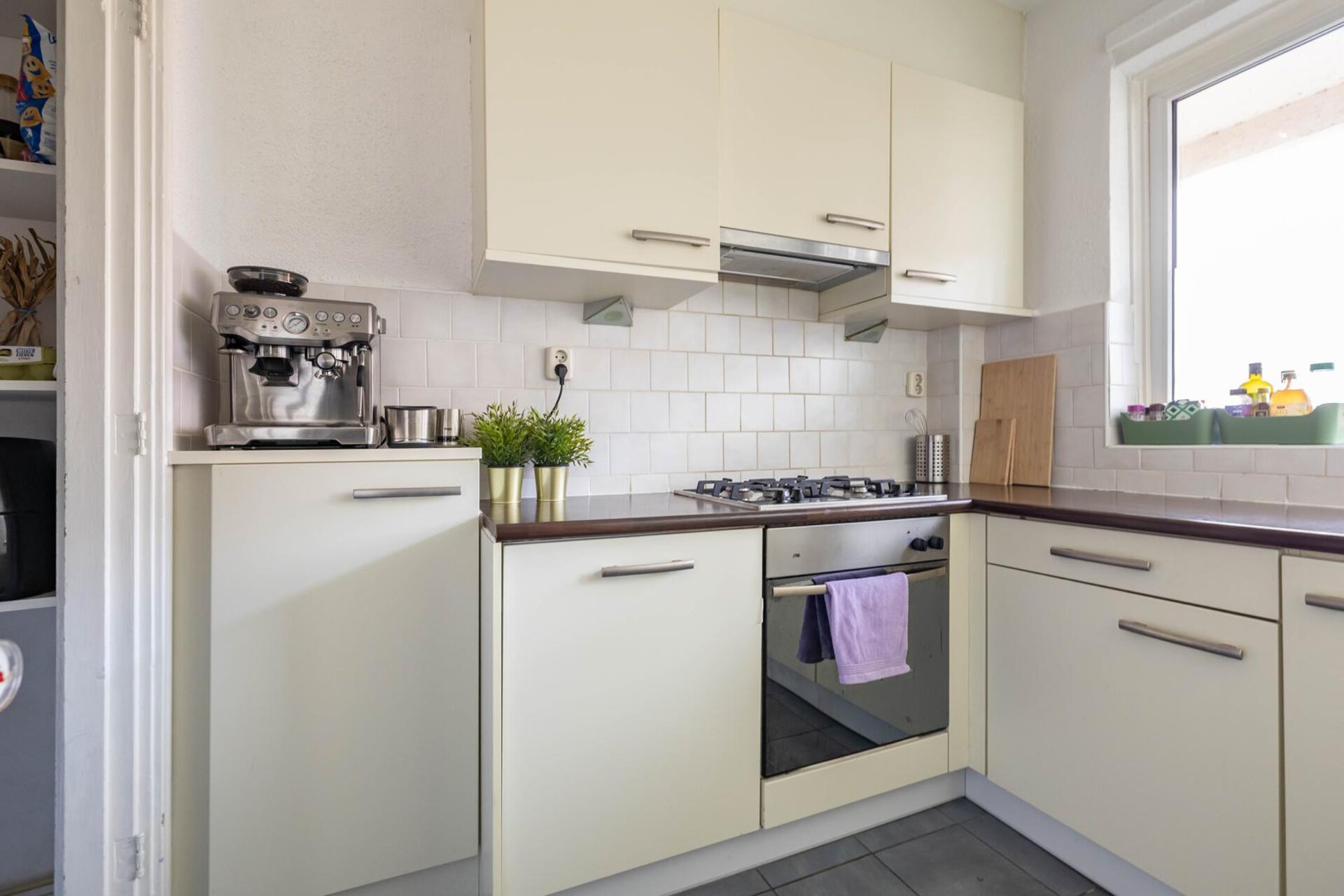 Galerij - entree, hal, toilet, dichte keuken met nette keukeninrichting o.a. voorzien van vaatwasser, gaskookplaat en koel/vriescombinatie, vaste kast met wasmachineaansluiting. Vernieuwde badkamer met inloopdouche, handdoekradiator en wastafelmeubel. Heerlijk lichte woonkamer met laminaatvloer en toegang naar het balkon aan de voorzijde op het zuidwesten. Twee slaapkamers van 10 en 8 m², beide voorzien van een vaste kast.