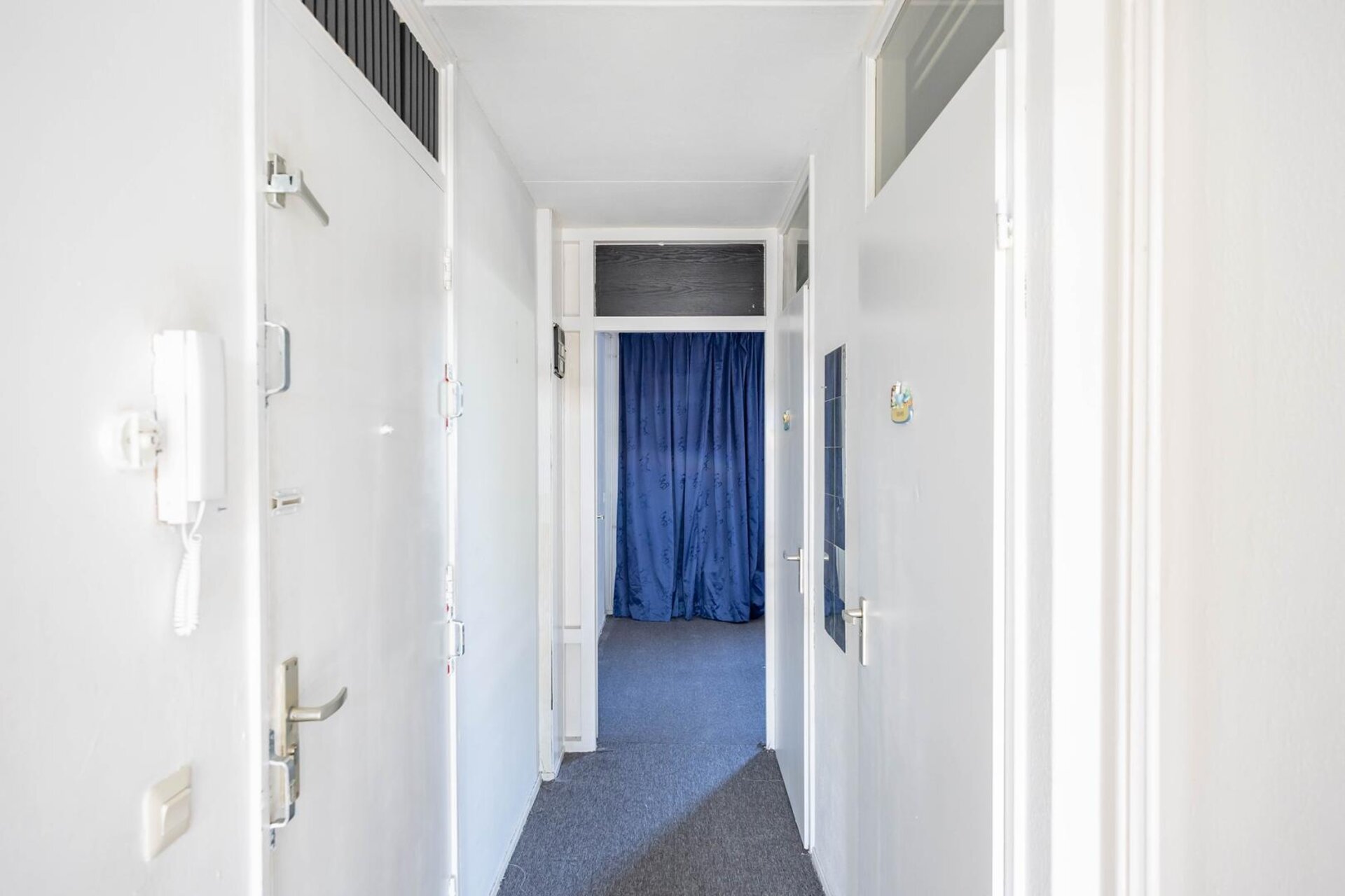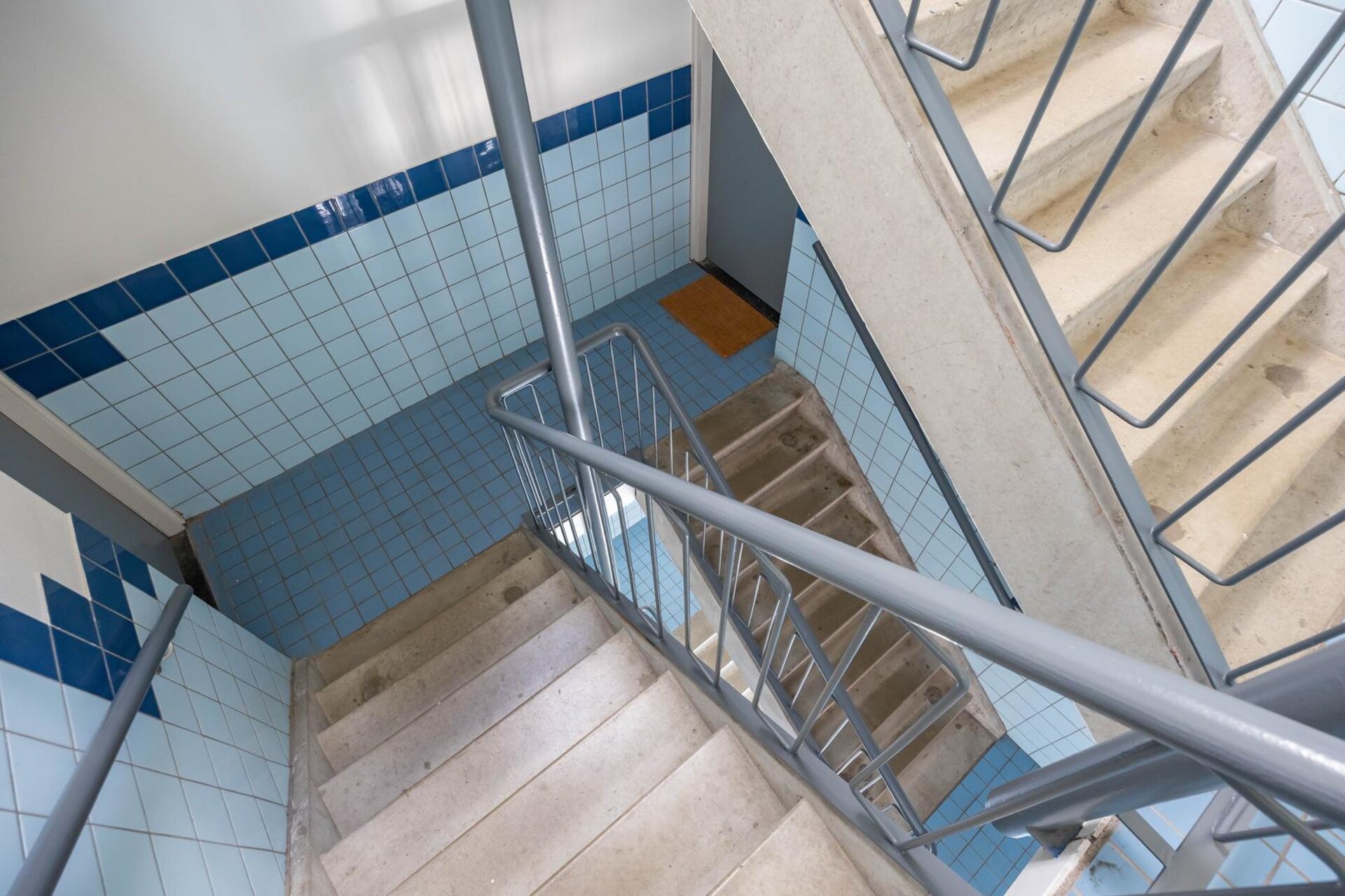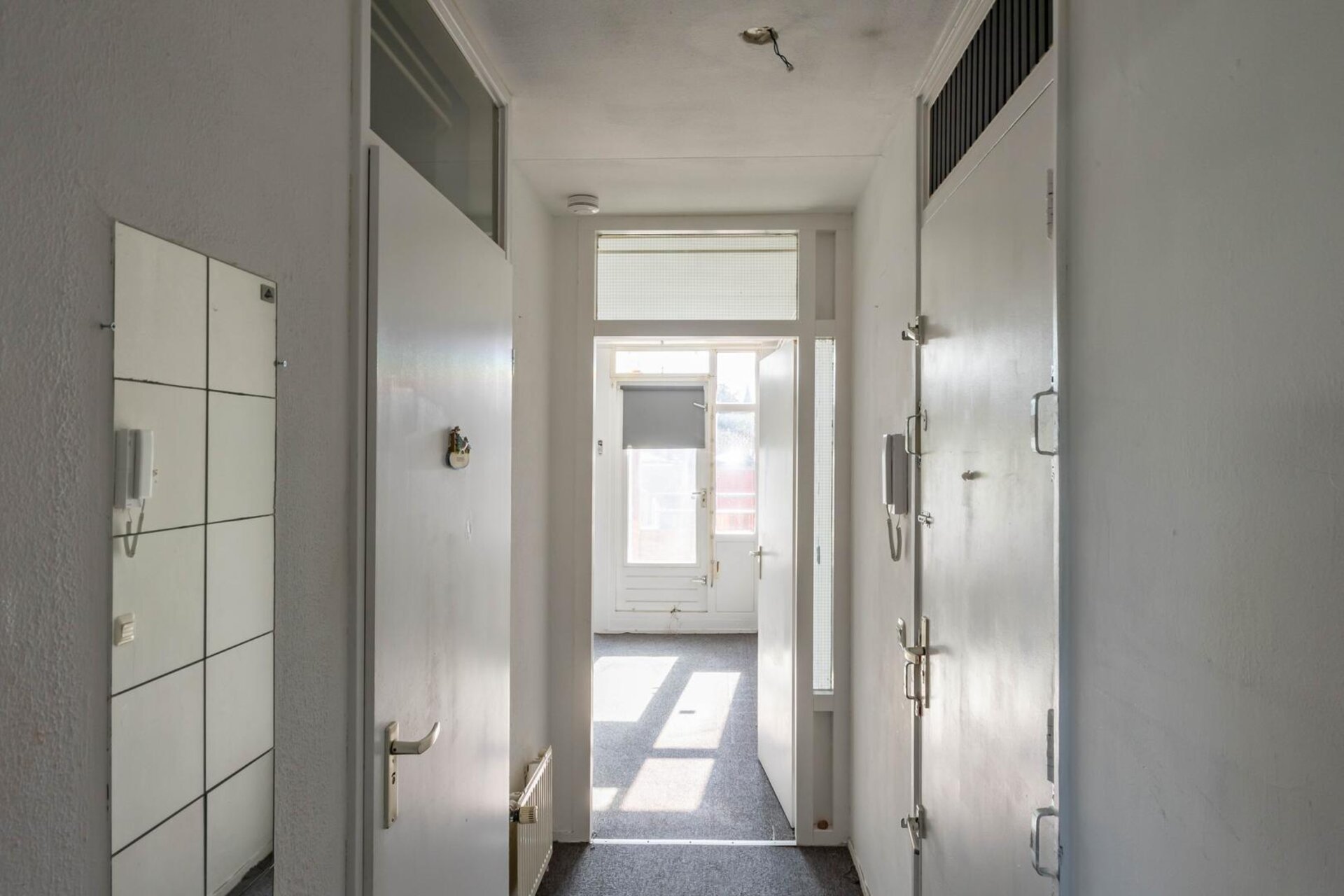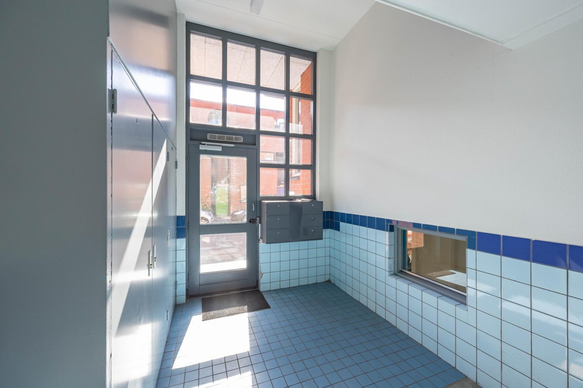 Afgesloten portiek met intercom, trapopgang en toegang tot de inpandige berging in het souterrain.