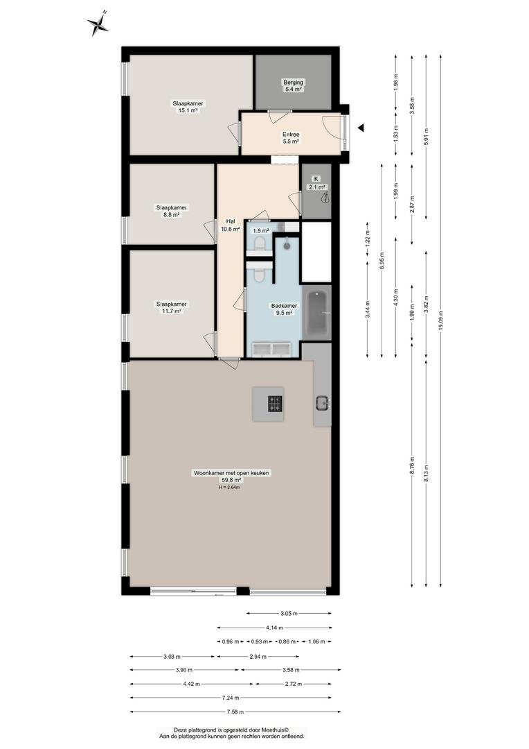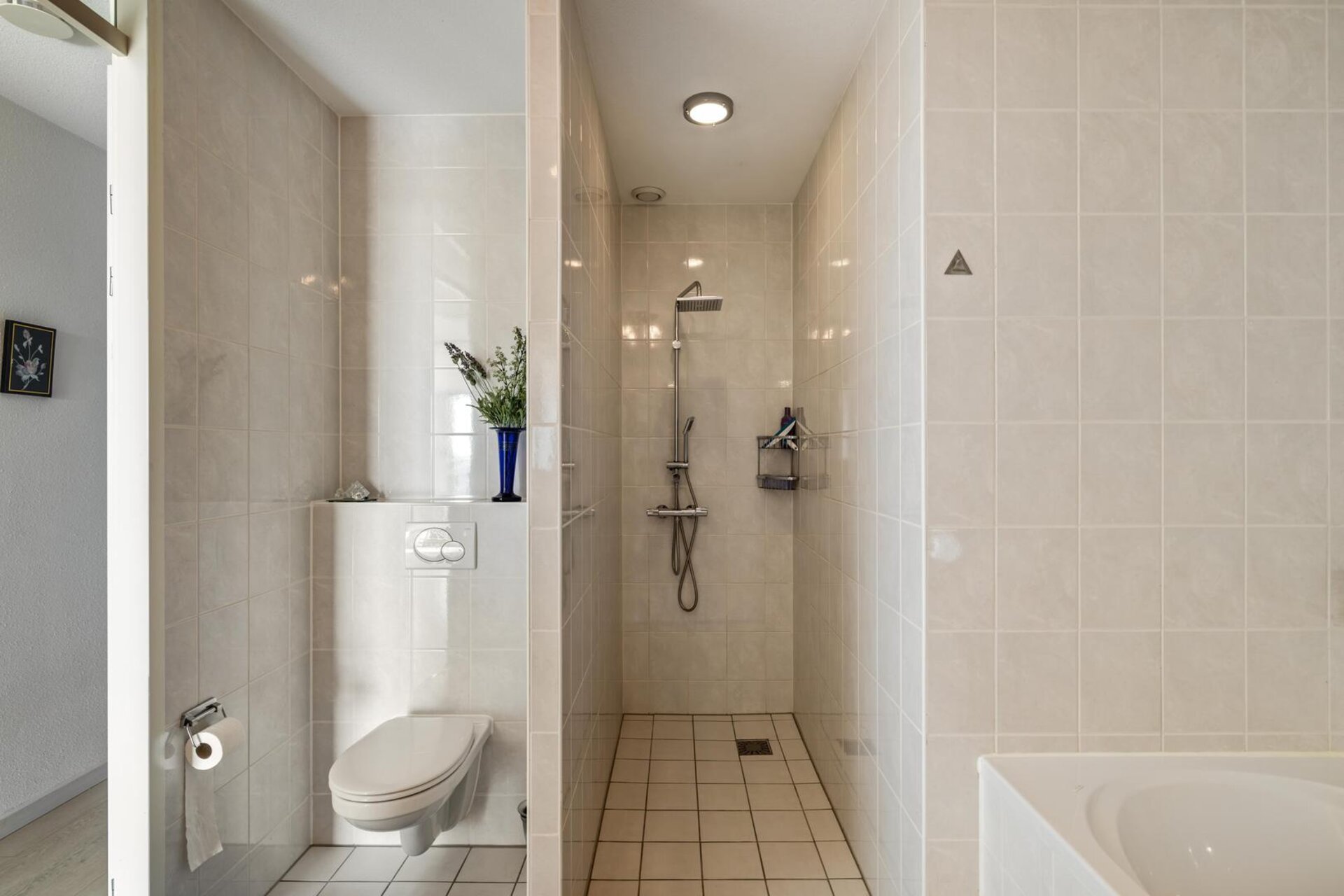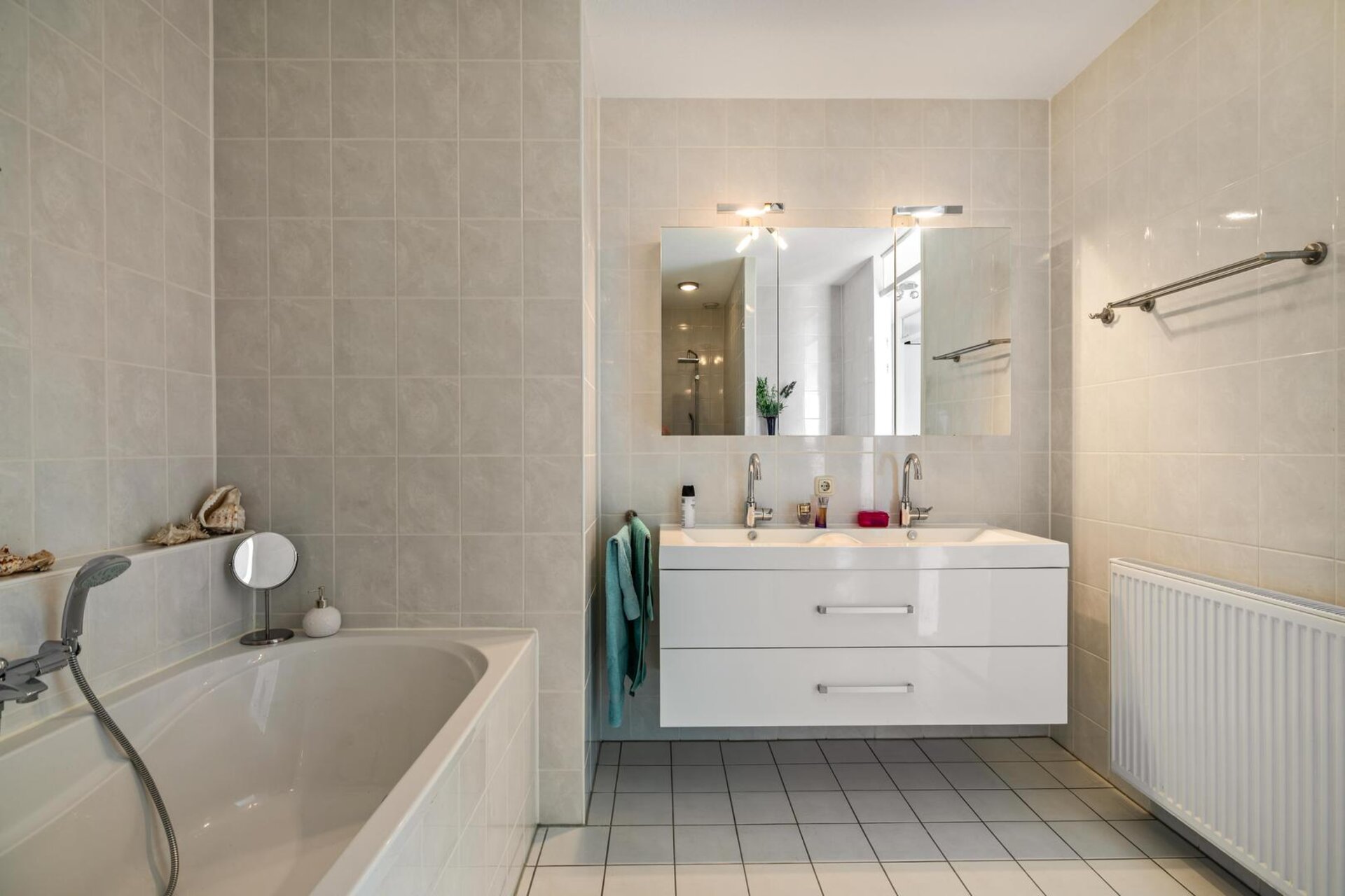 Ruime hal met toegang tot alle vertrekken, waaronder een berging (circa 5 m²), stookruimte en separaat toilet voorzien van wandcloset en fonteintje. De royale woonkamer van circa 60 m² beschikt over een nette laminaatvloer en moderne open keuken met kookeiland, uitgerust met diverse inbouwapparatuur. Dankzij de vele grote raampartijen heeft de woonkamer veel natuurlijk lichtinval. Drie ruime slaapkamers van respectievelijk 9 m², 12 m² en 15 m², alle met een fraai uitzicht over de binnenstad. De badkamer (circa 10 m²) is voorzien van inloopdouche, ligbad, dubbele wastafel met -meubel en een tweede toilet.