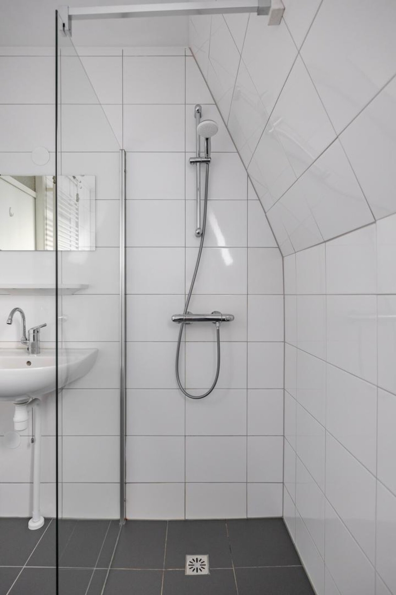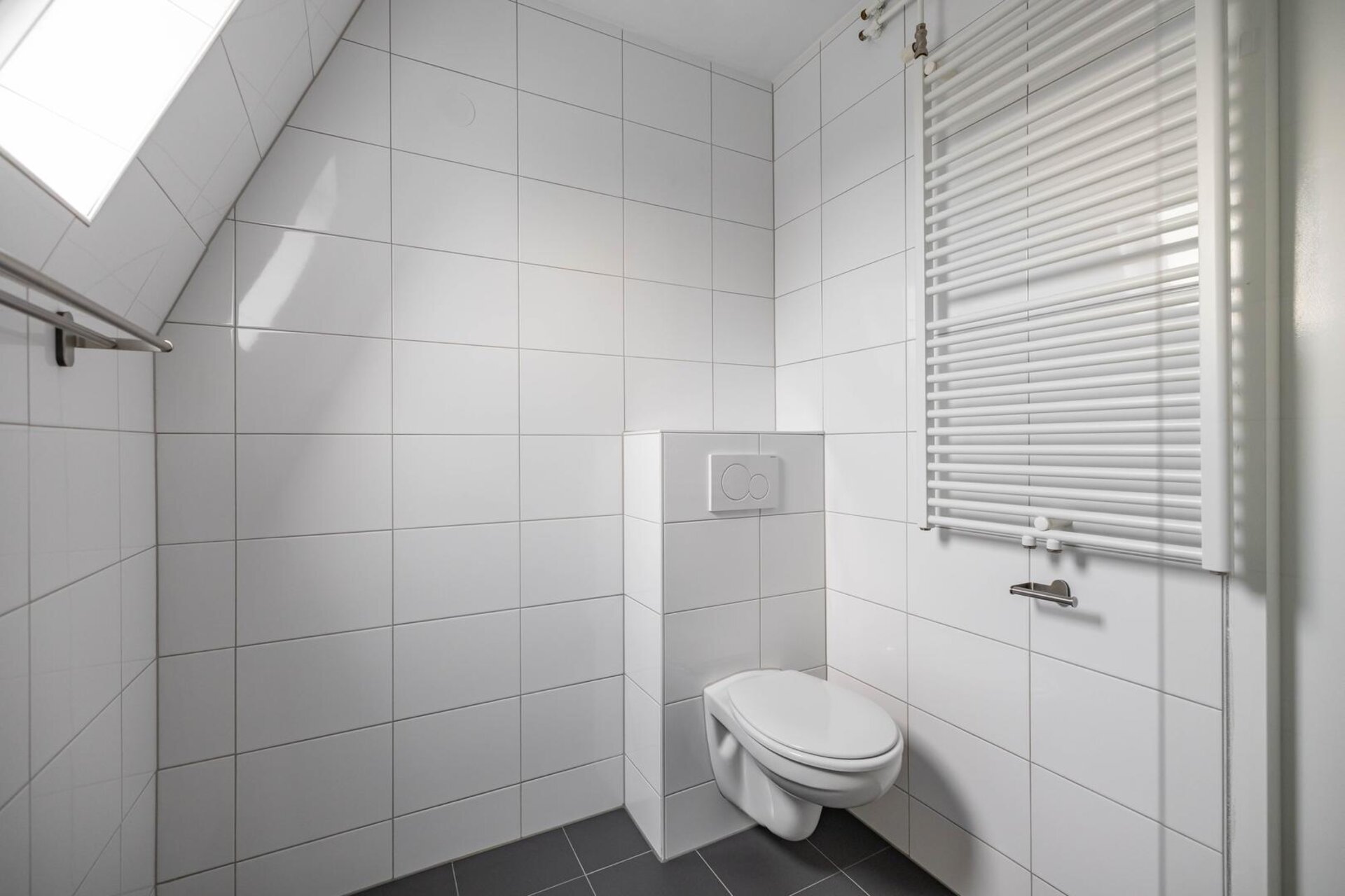 Vernieuwde moderne badkamer voorzien van inloopdouche, toilet(hangend closet), inloopdouche, wastafel, wasmachineaansluiting en een tuimelraam voor lichtinval en extra ventilatie.
