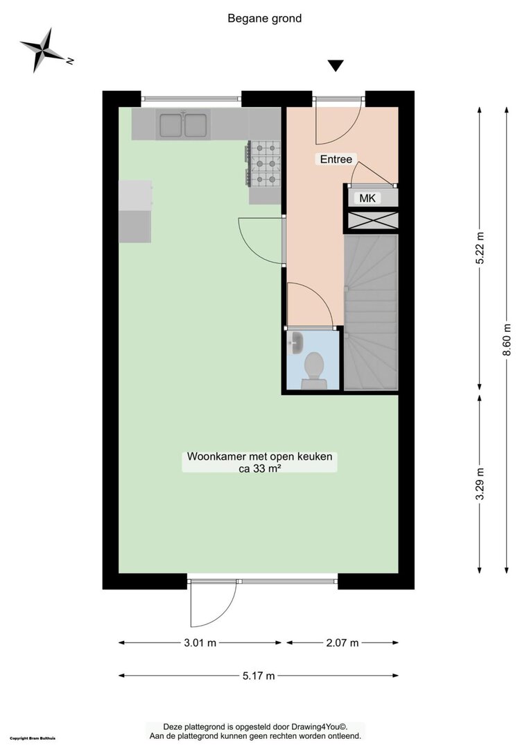 Entree - hal - meterkast - hangend toilet met fonteintje - L-vormige woonkamer met vloerverwarming, strak gestuukte wanden, deur naar de tuin en een open keuken met een strakke complete keukeninrichting, o.a. voorzien van vaatwasser, magnetron, oven, koelkast, 5 pits-gaskookplaat en afzuigkap.