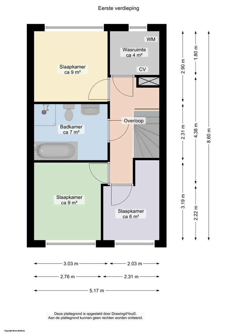 Overloop - 3 slaapkamers (9, 9 en 6m²) - luxe complete badkamer (2017) met ligbad, separate douche, 2e toilet, wastafelmeubel en handdoekradiator - berging annex was- en stookruimte (4m²).