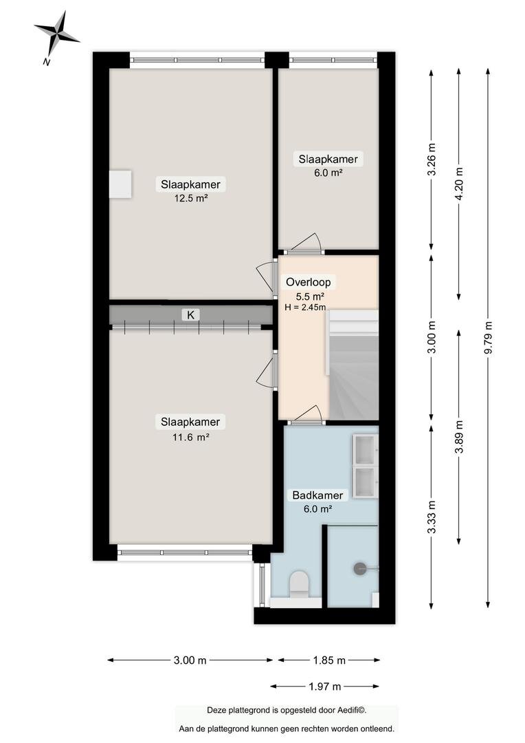 Via de overloop (ca 6 m²) heeft u toegang tot drie slaapkamers (respectievelijk te weten ca 13 m², 12 m² en 6 m² groot), de trapopgang naar de tweede verdieping en de badkamer (ca 6 m²). De badkamer biedt u een dubbele wastafel, inloopdouche en toilet.