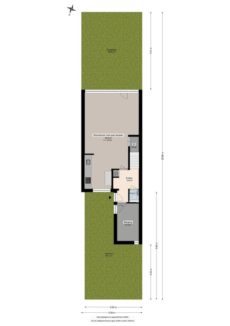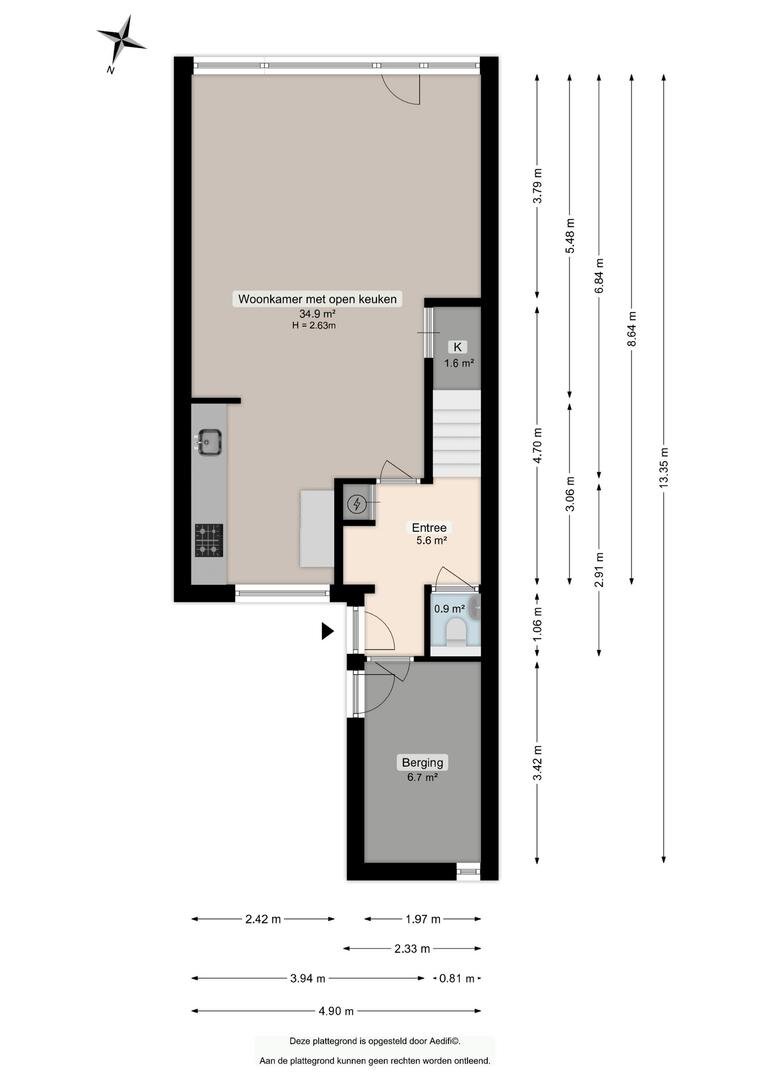 Vanuit de entree/hal (ca 6 m²) is er toegang tot het toilet (ca 1 m²), trapopgang en berging met eigen entree (ca 7 m²). Vanuit de hal bereikt u eveneens de lichte woonkamer met open keuken en eetgedeelte (ca 35 m²). De keuken is voorzien van diverse inbouwapparatuur. De woonkamer biedt u toegang tot de tuin die gelegen is op het zuiden. De tuin is middels een achterom te bereiken.