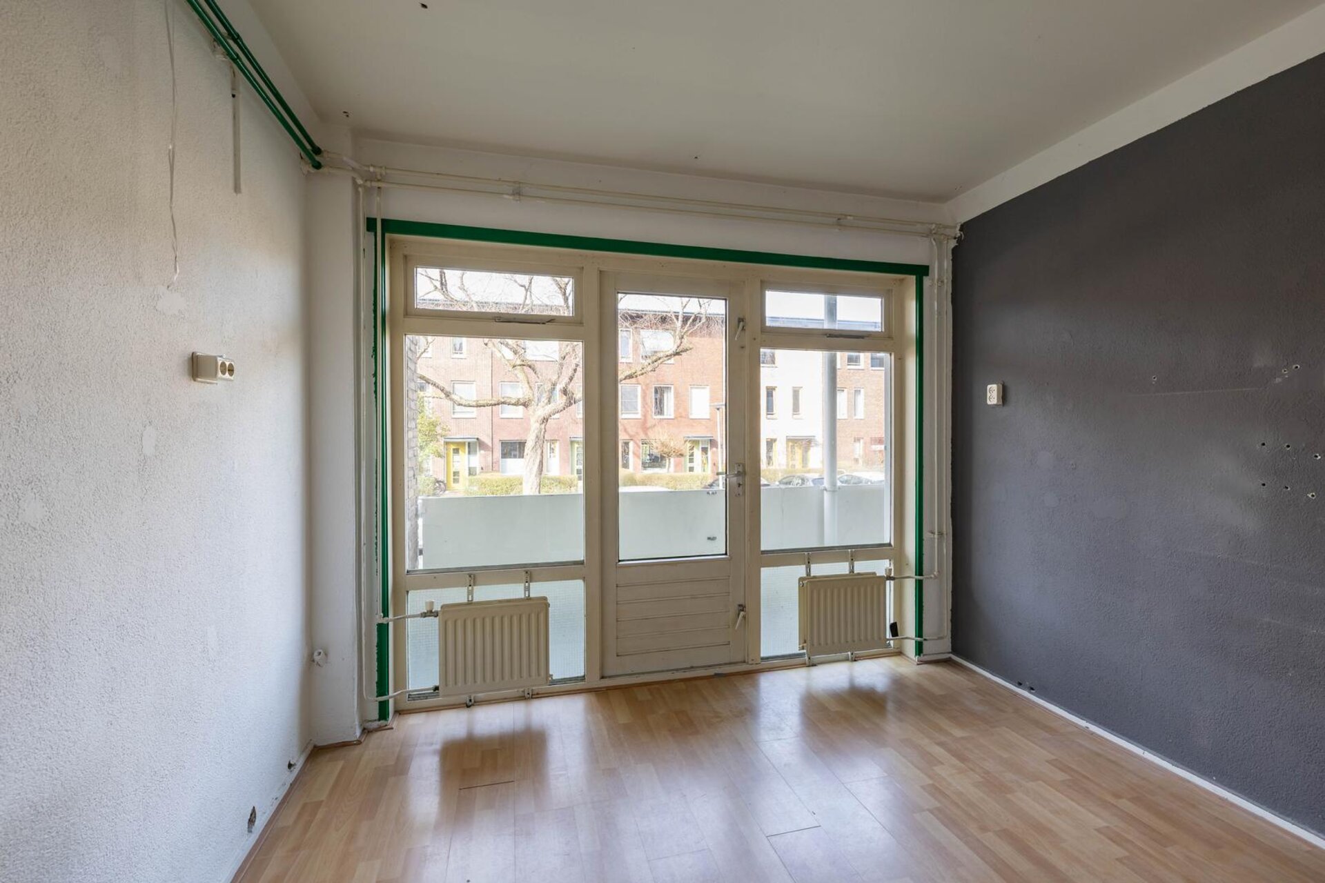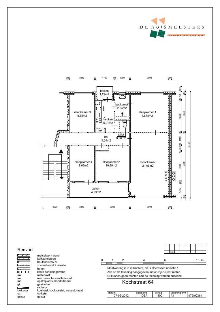 Entree/hal met toegang tot 2 slaapkamers, respectievelijk te weten circa 8 en 9 m². De keuken (ca. 5 m²) is eveneens bereikbaar vanuit de hal en voorzien van een keukenblok. Tevens heeft u vanuit de keuken toegang tot de badkamer (ca. 3 m²), welke is voorzien van een wastafel en douche. Het separate toilet en de woonkamer (ca. 21 m²) zijn eveneens bereikbaar vanuit de hal. De open woonkamer is voorzien van grote ramen en geeft toegang tot een eventuele vierde slaapkamer van maar liefst circa 13 m² groot. Vanuit de grote slaapkamer en de keuken heeft u toegang tot twee balkons.