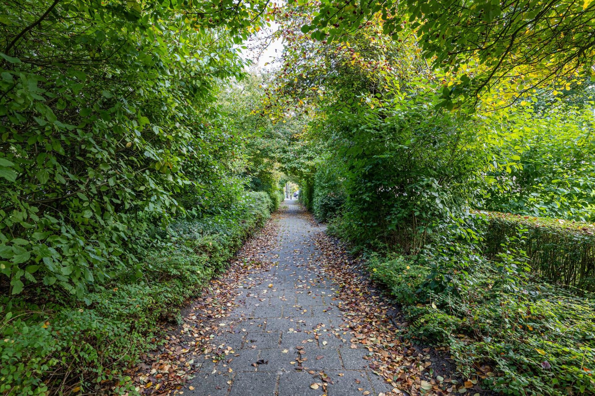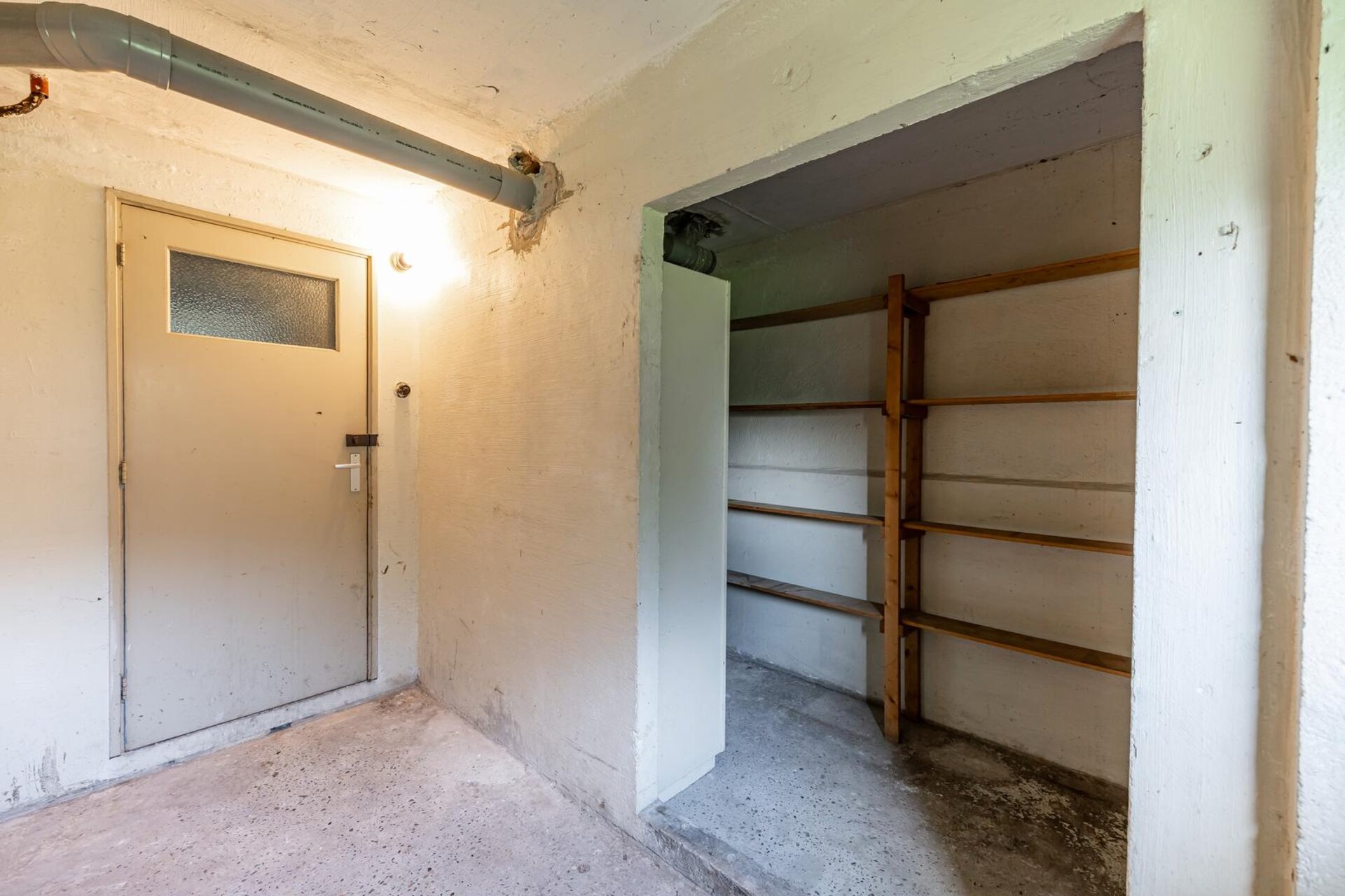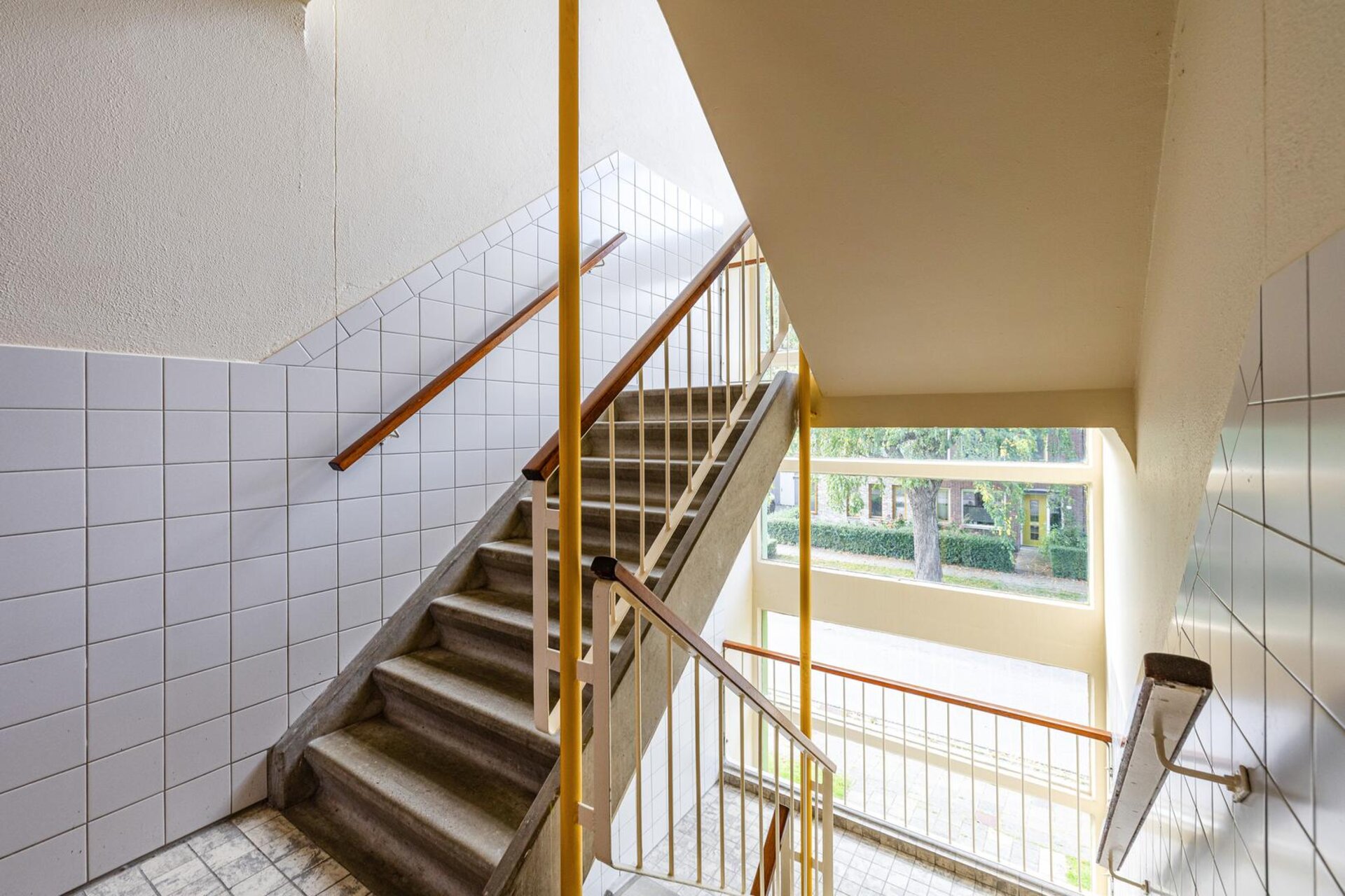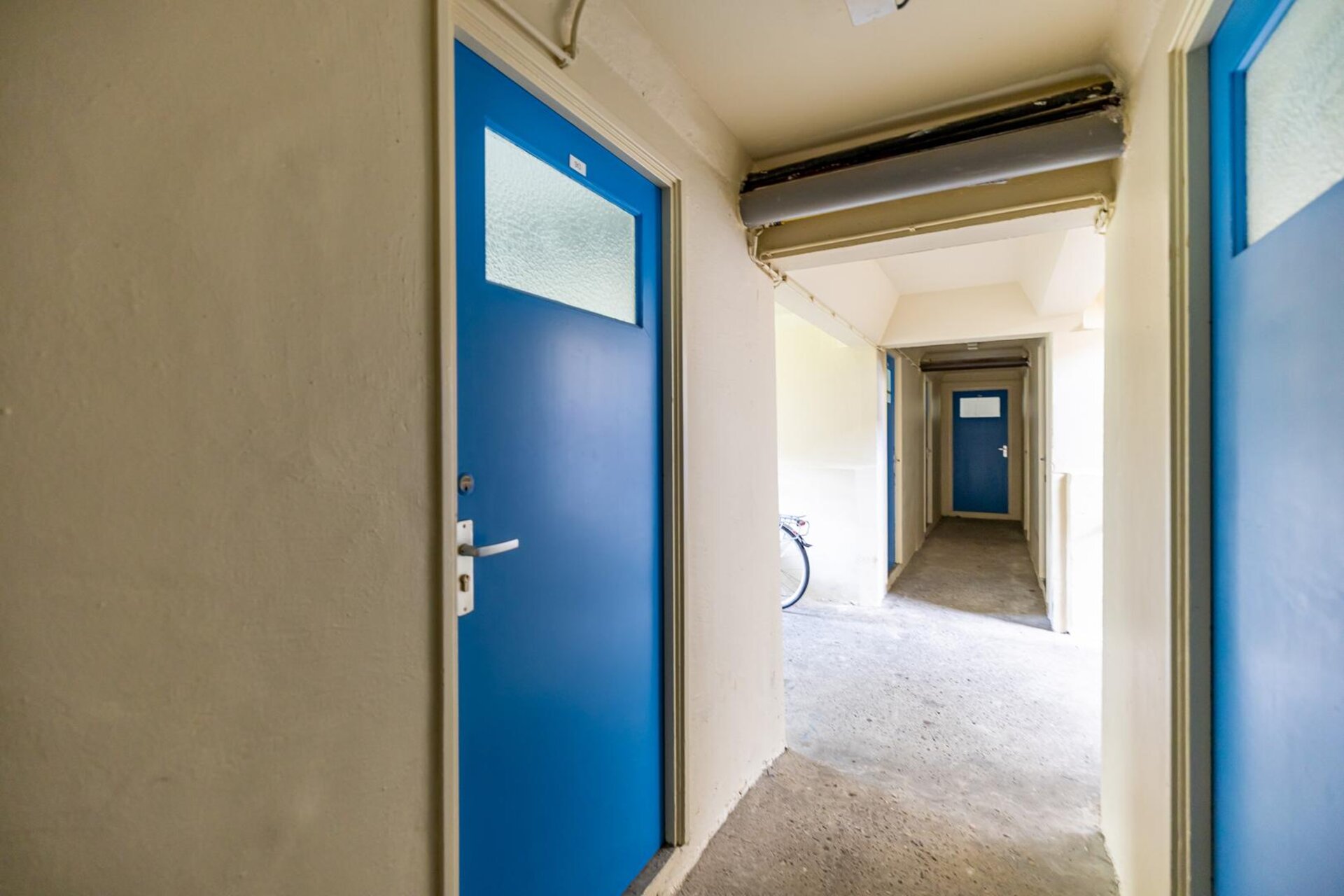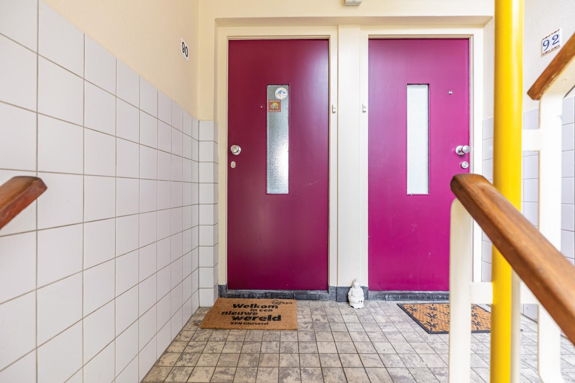 Afgesloten portiek met intercom, trapopgang en toegang tot de inpandige bergingen in het souterrain.
