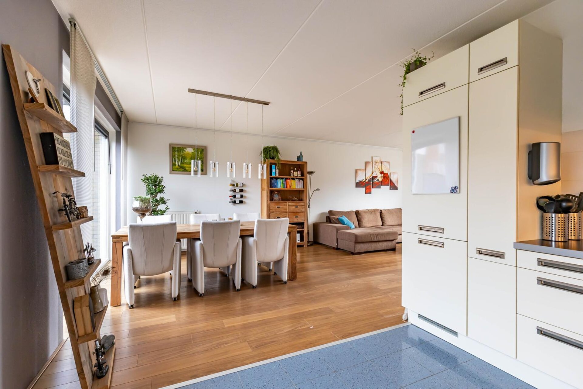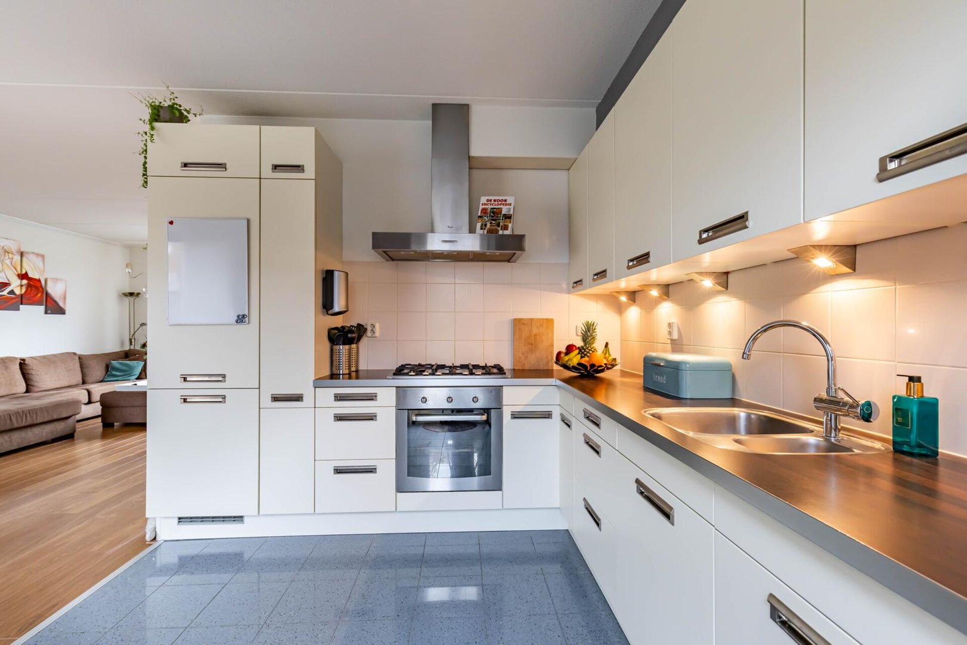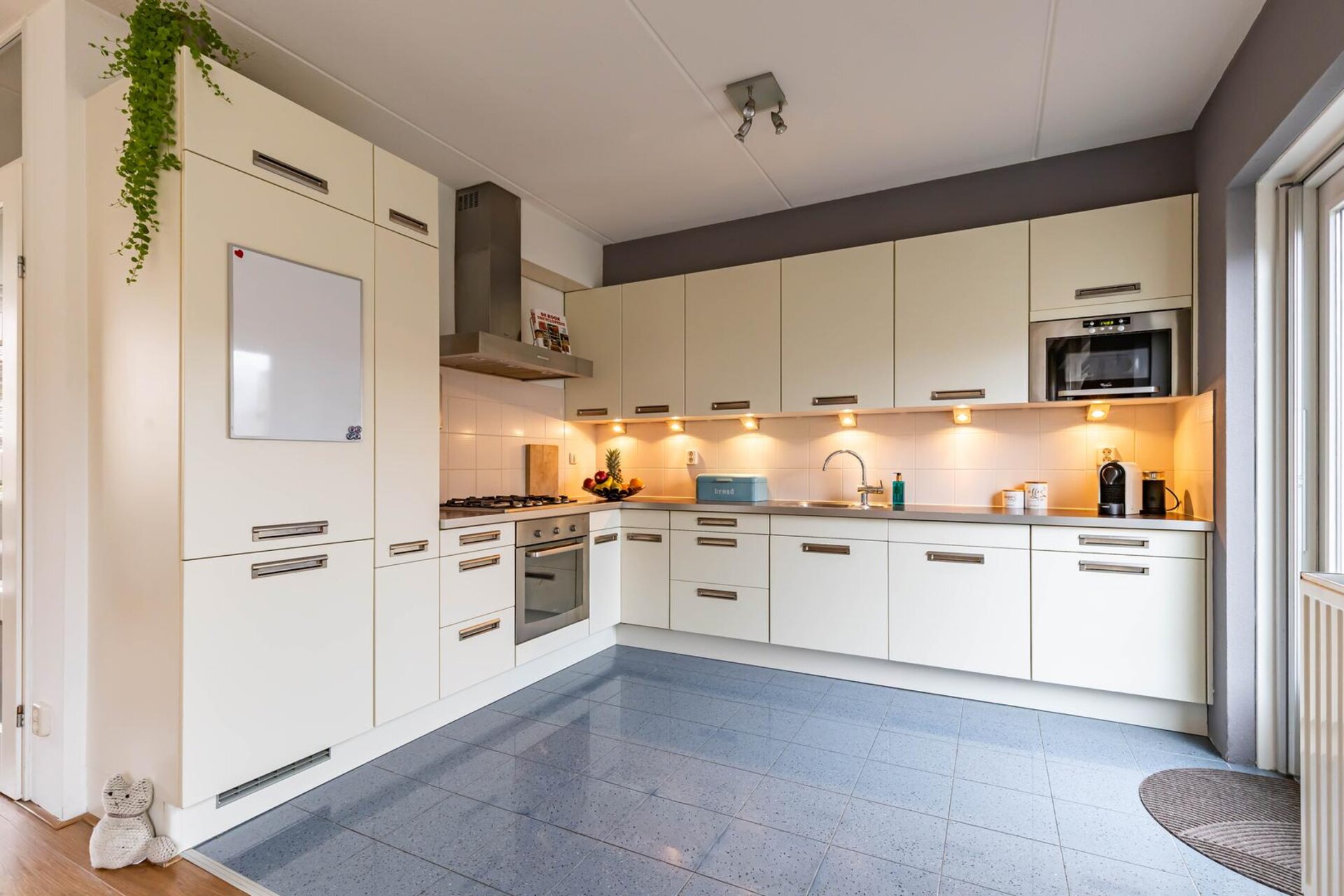 Bij binnenkomst tref je een ruime hal met toilet, trapopgang en een diepe trapkast. De lichte woonkamer met grote raampartijen biedt aan de voorzijde volop ruimte voor een gezellige en ruime zithoek. Aan de achterzijde vind je de open woonkeuken, geplaatst in een hoekopstelling met diverse