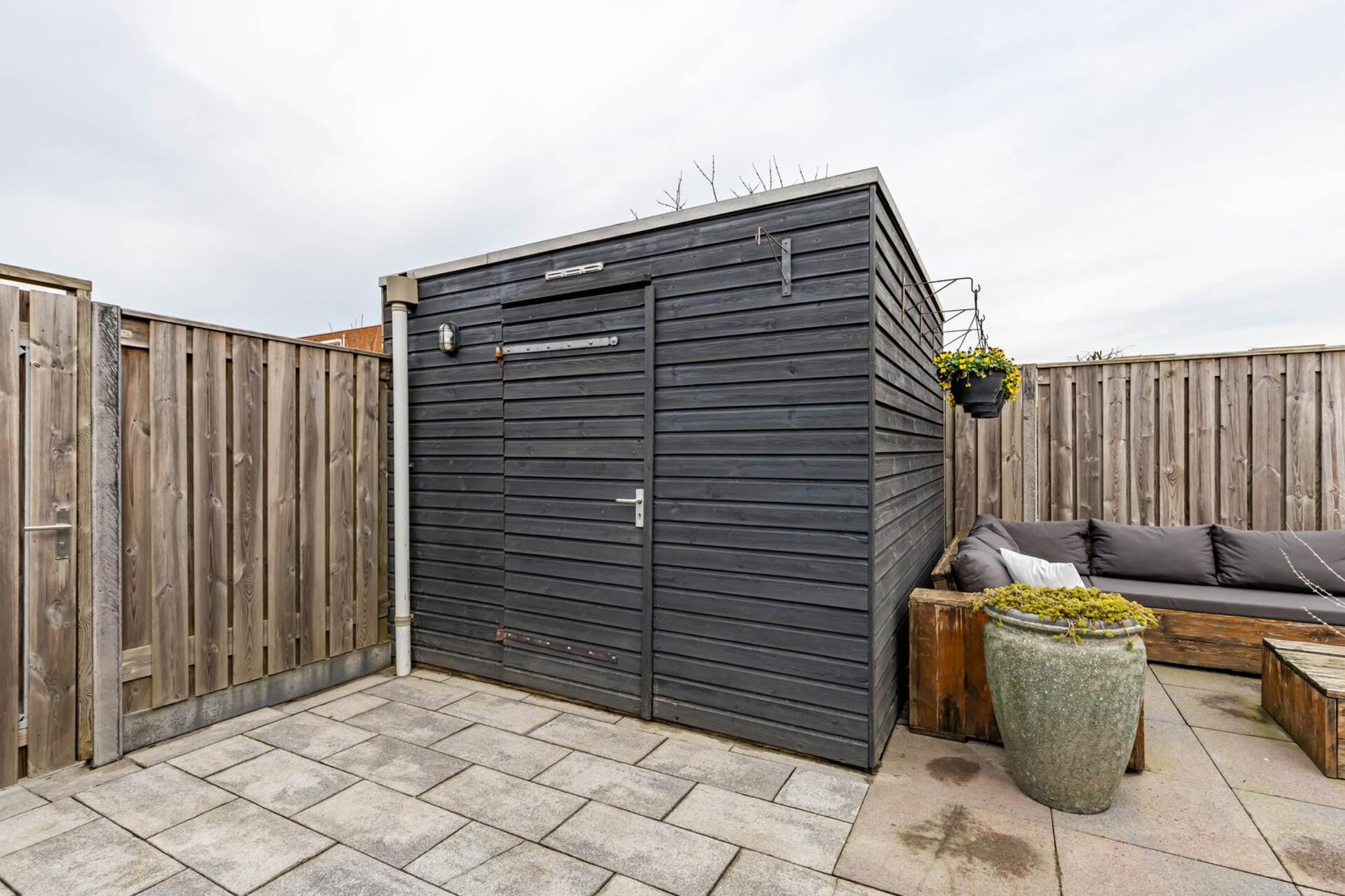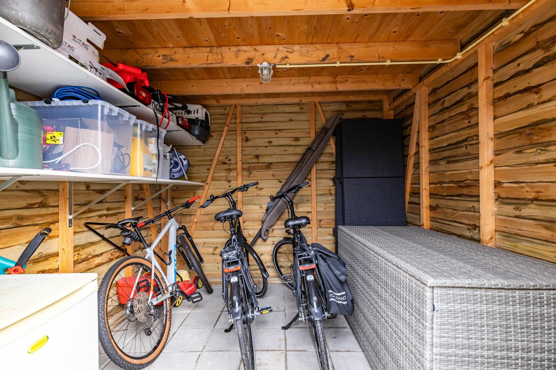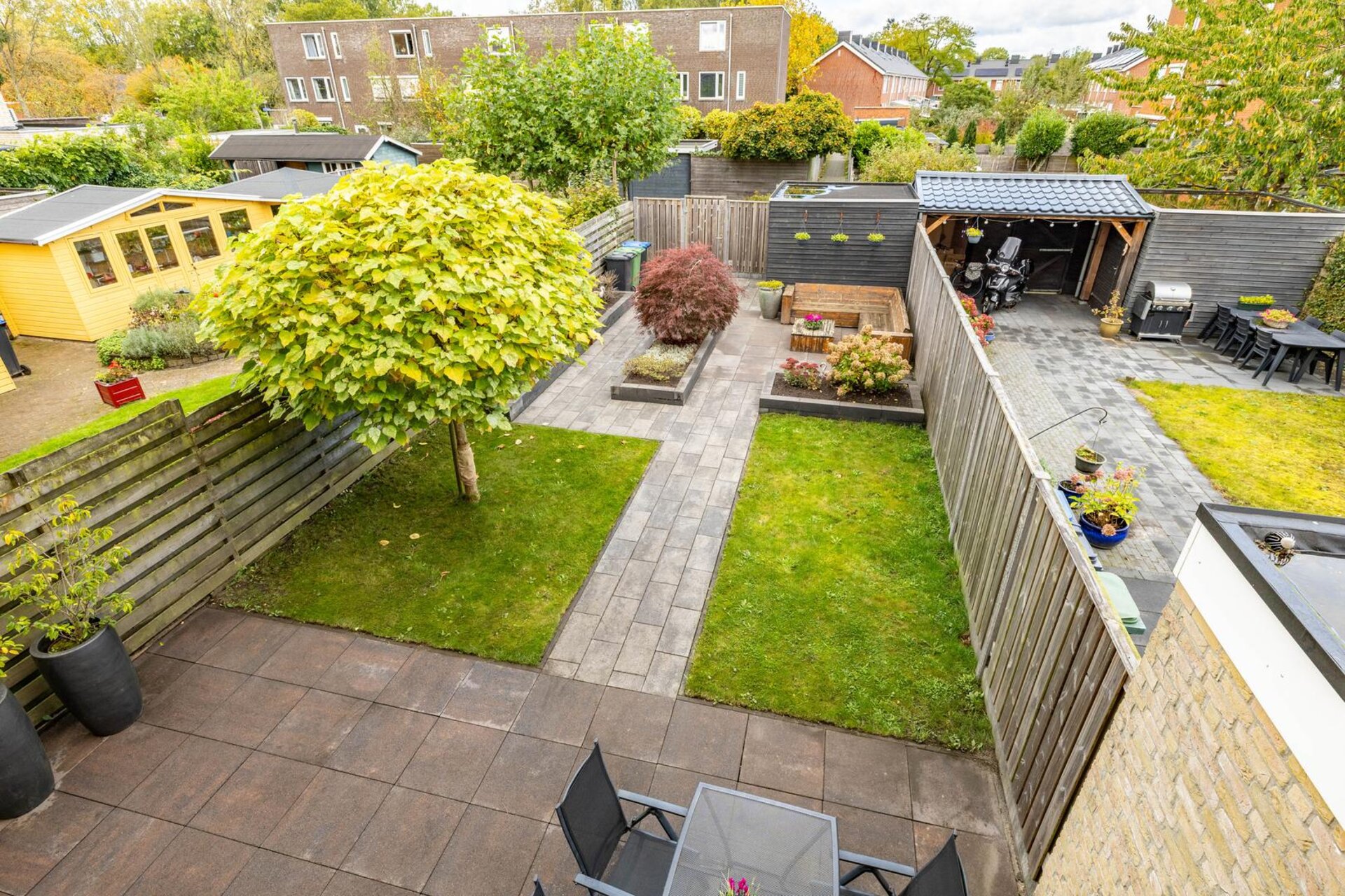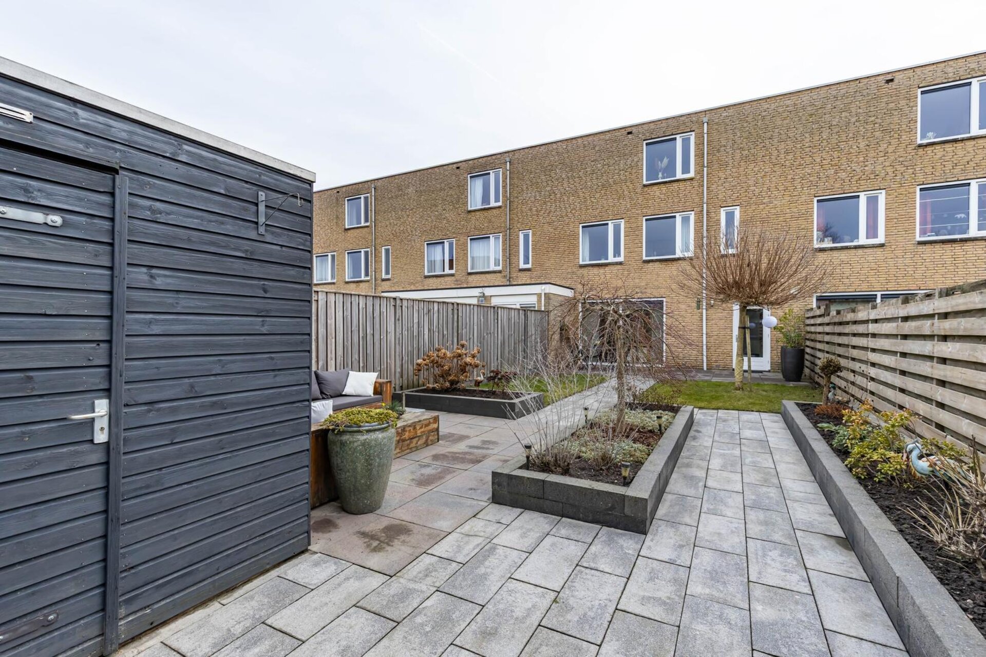 Aan de voorzijde een nette aangelegde tuin als entree naar de woning. De 18 meter diepe achtertuin is onderhoudsvriendelijk aangelegd en bevat twee terrassen waar je vanaf het middaguur tot en met zonsondergang de gehele dag kunt genieten van de zon. Deze tuin is voorzien van een achterom en het stallen van je fiets en opbergen van je tuingereedschap is geen enkel probleem in de aanwezige vrijstaande berging (9 m²).