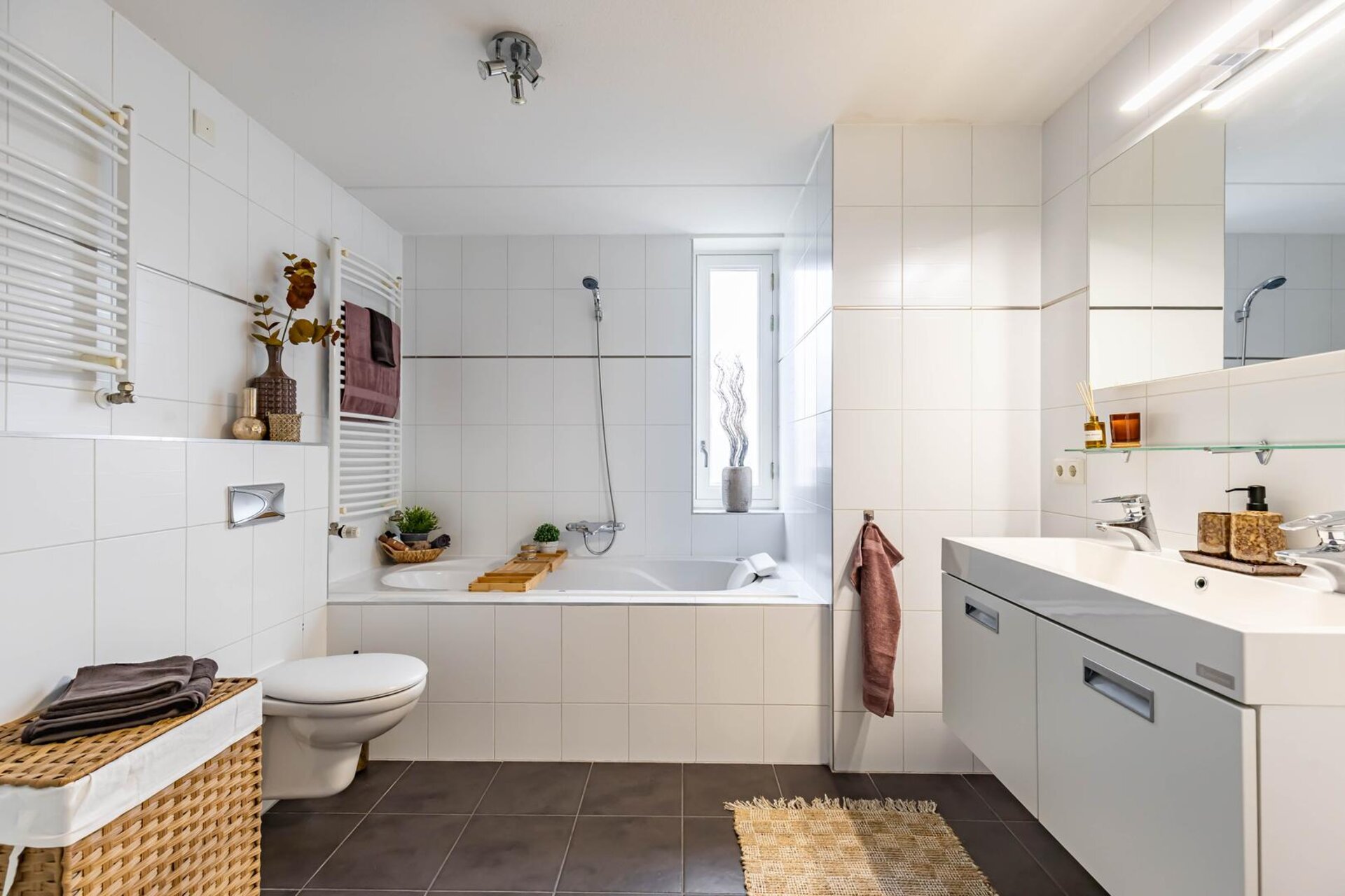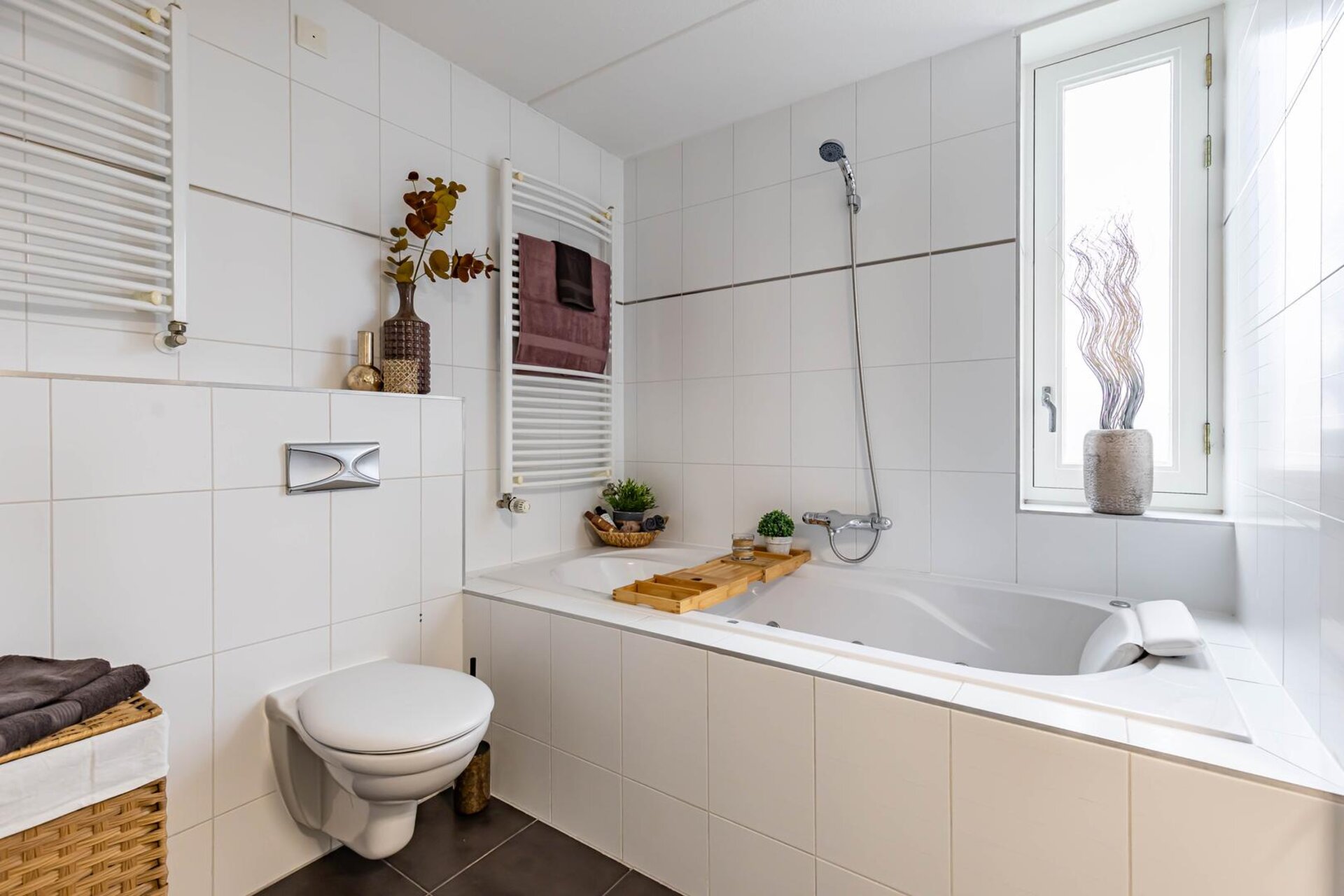 Overloop, met daaraan 2 ruime slaapkamers (21 en 14 m²), een berging en een nette badkamer waarin een ligbad met whirlpoolfunctie, douchecabine, wastafel met twee fonteintjes en een tweede toilet te vinden is.