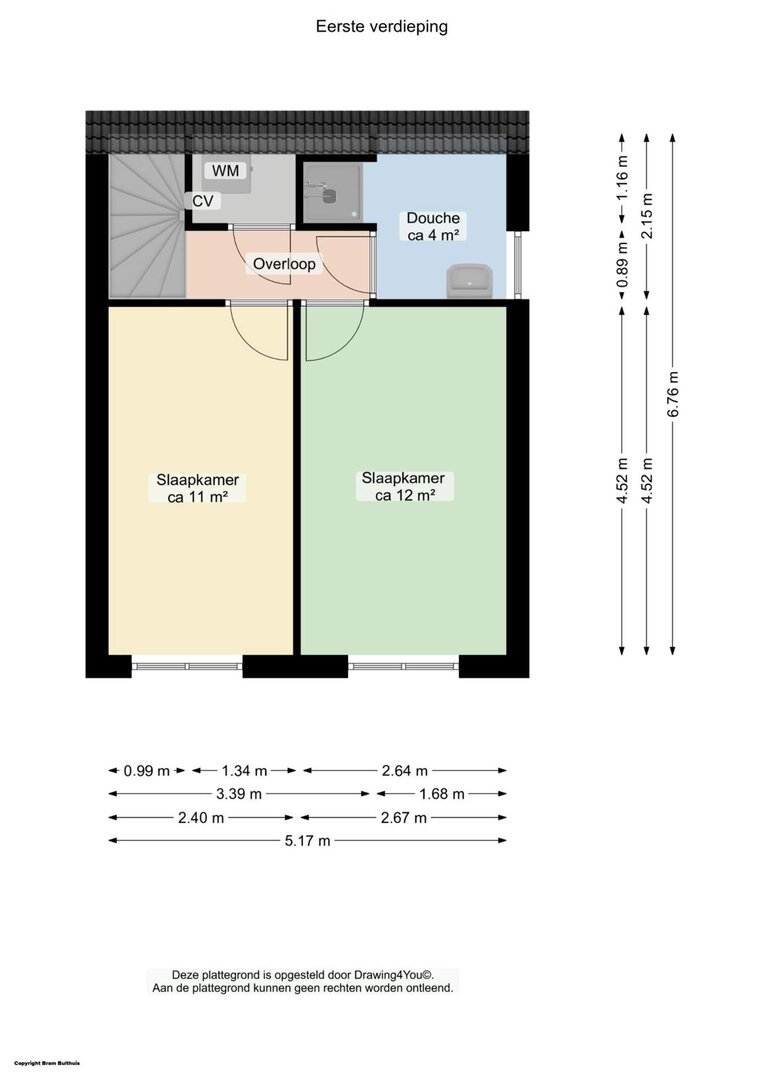 overloop met daaraan twee ruime slaapkamers (ca. 11 en 12 m²), stook-/ en wasruimte. De nette badkamer is voorzien van douchehoek en wastafel.