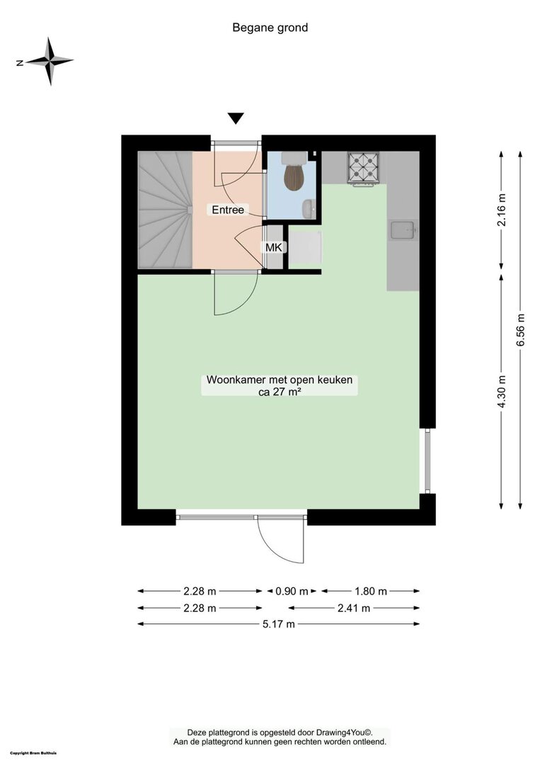 entree/hal, toilet met fonteintje, woonkamer met moderne open keuken (samen ca. 27 m²). Vanuit de woonkamer is er toegang tot de besloten, groene tuin op het zonnige westen. De keuken is geplaatst in hoekopstelling en voorzien van diverse inbouwapparatuur.