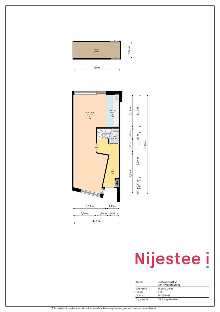 Entree/hal (ca. 6 m²) met toegang tot het toilet en de trapopgang. De open en lichte woonkamer is circa 26 m² groot en biedt toegang tot de keuken (ca. 4 m²). De keuken is voorzien van opstelling en geeft de mogelijkheid om de tuin te bereiken. De tuin is voorzien van een berging.