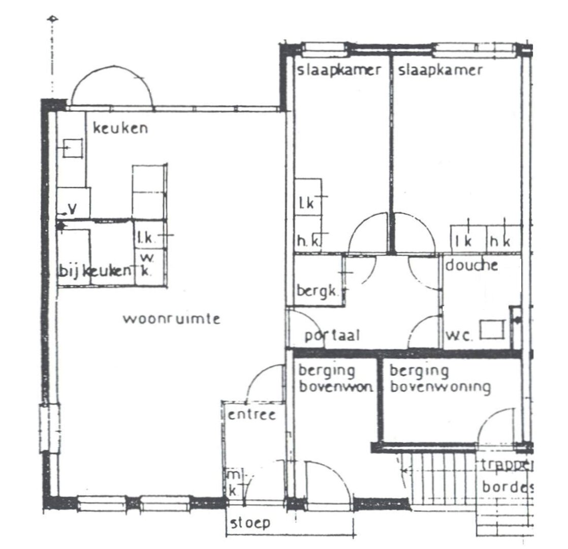 Entree/hal met meterkast - lichte woonkamer van circa 31m² - halfopen keuken van circa 6m² met eenvoudige opstelling - bijkeuken met CV-ketel, kasten en witgoedaansluitingen - vanuit de woonkamer een hal naar twee slaapkamers van 9 en 12m² met vaste kasten - badkamer met douche, wastafel en wc - via de keuken is de ruime tuin op het westen toegankelijk - achterom is de vrijstaande stenen berging van circa 4m² te vinden.