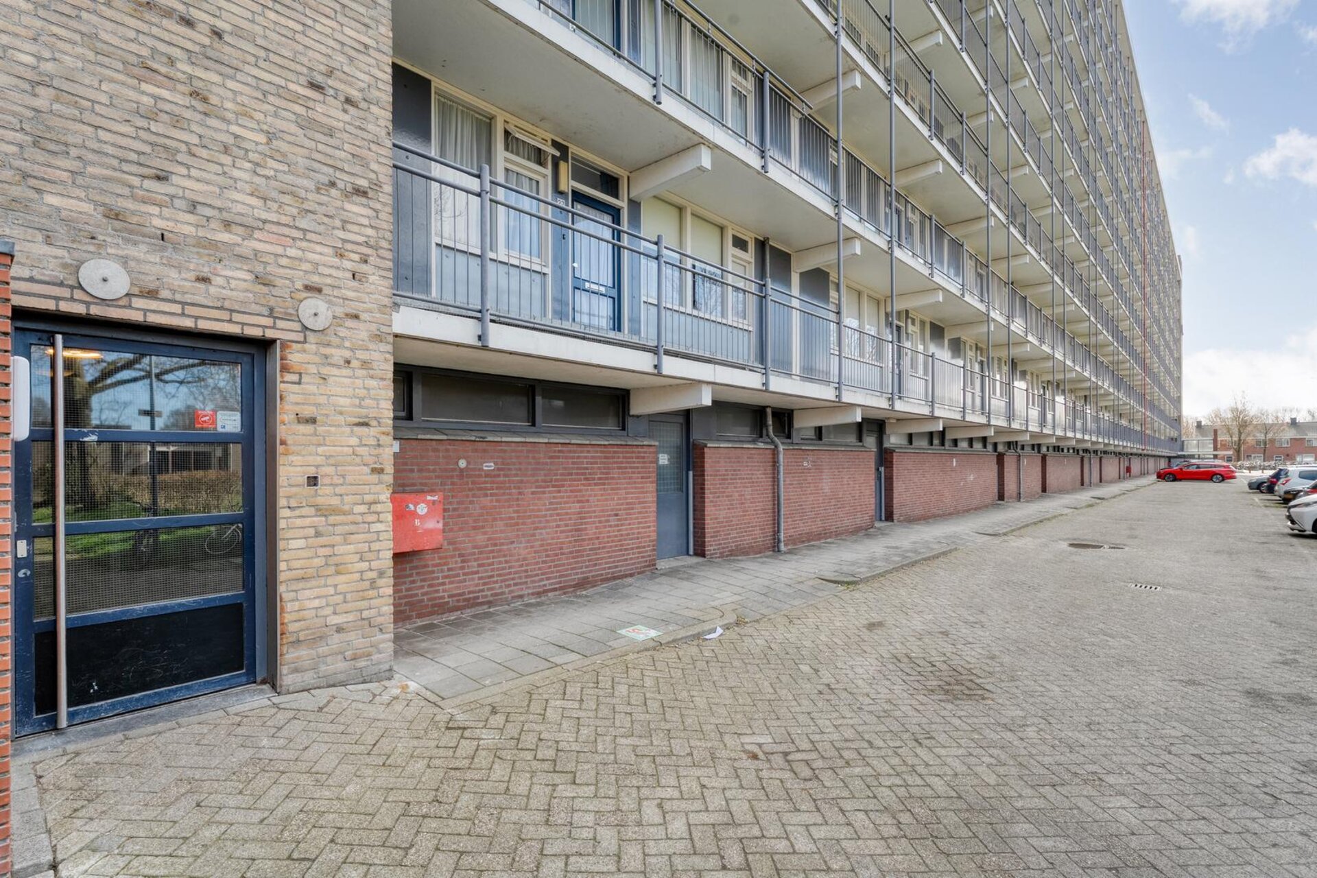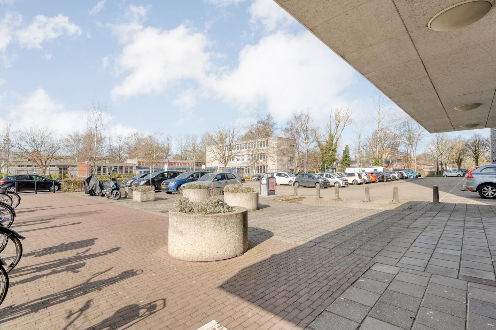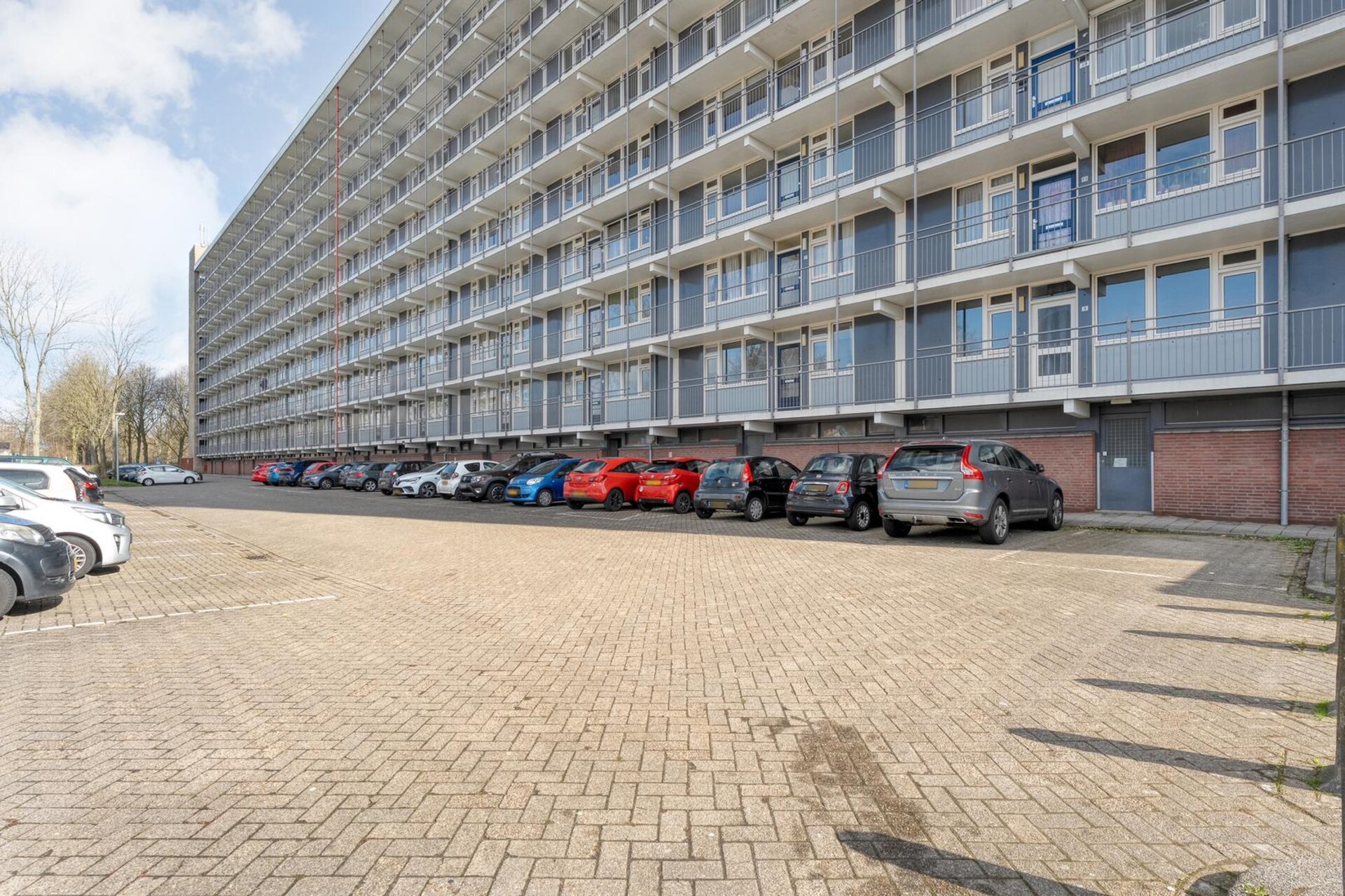 Aan de voorzijde van het complex is een groot parkeerterrein en afgesloten met een slagboom.