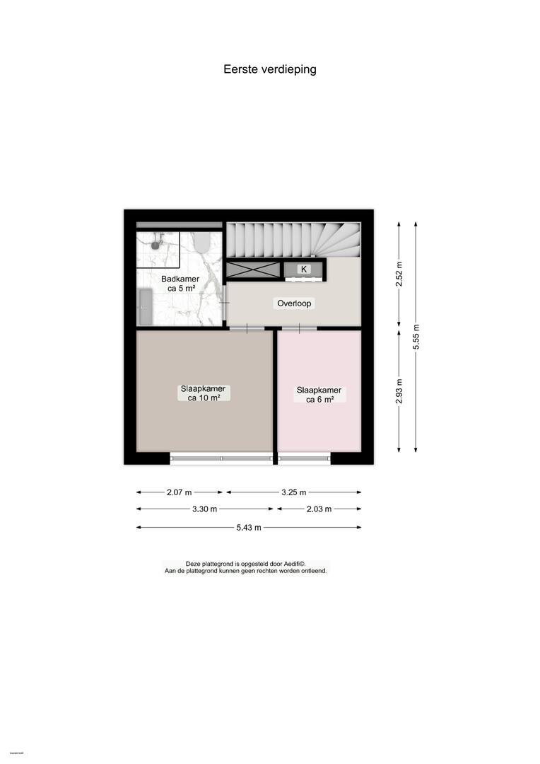 Overloop met aan de voorzijde van de woning de twee slaapkamers, respectievelijk 10 m² en 6 m². De fraaie badkamer is voorzien van inloopdouche, wastafelmeubel en een tweede toilet.