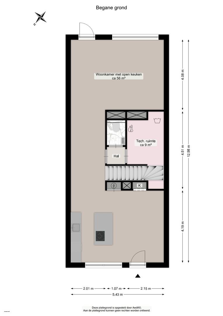 Via de entree kom je meteen in de royale woonkeuken, de moderne open keuken is geplaatst in rechte opstelling en voorzien van kookeiland en diverse inbouwapparatuur. De woonkamer ligt tuingericht aan de achterzijde van de woning. Vanuit de woonkamer is er tevens toegang tot een halletje dat leidt naar het toilet met wandcloset en fonteintje en naar de ruime technische ruimte met C.V.-opstelling, wasmachine-aansluiting en voldoende bergruimte. Via de trap in de woonkamer bereik je de eerste verdieping.