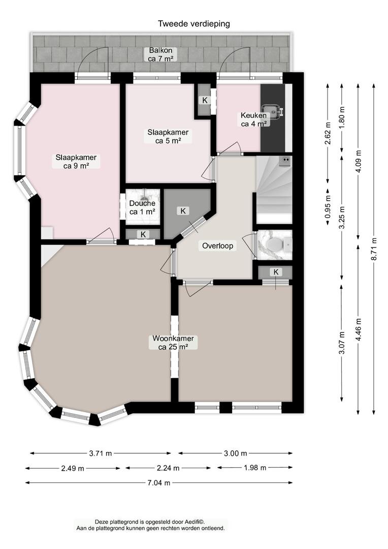Overloop, toilet, royale woonkamer van circa 25 m² met prachtige ronde erker en toegang tot de eerste slaapkamer (circa 9 m²), voorzien van douche en toegang tot het balkon. Eenvoudige keuken voorzien van wasbak, tevens met toegang tot het ruime balkon op het noordoosten (circa 7 m²). Tweede slaapkamer is circa 5 m².