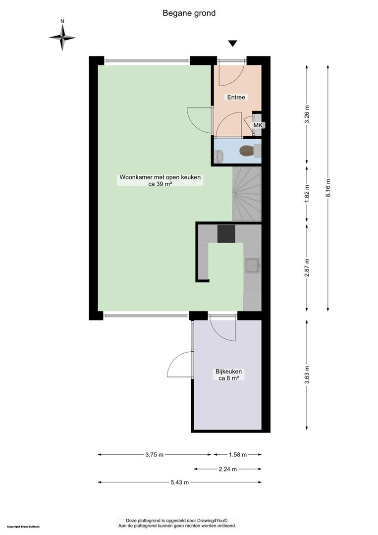 entree/hal met toegang tot de moderne toiletruimte, ruime woonkamer met open keuken van ca. 39 m². De open keuken van ca. 6 m² is voorzien van diverse inbouwapparatuur. Vanuit de keuken kom je in de bijkeuken met deur naar de tuin op het zonnige zuiden, de tuin is voorzien van royaal terras, vrijstaande berging en achterom.