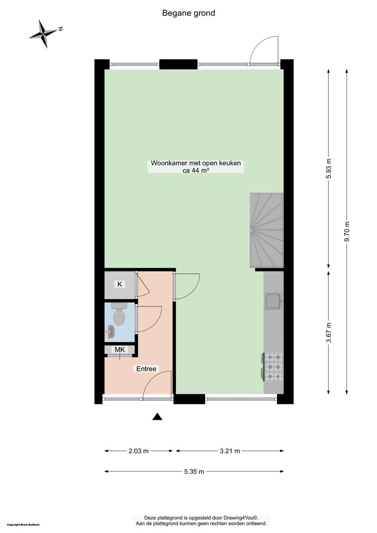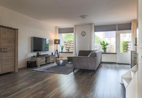 Entree - hal met vaste kast en toilet - royale en lichte tuingerichte woonkamer circa 44m² met laminaatvloer, tuindeur en open keuken met strakke keukeninrichting o.a. voorzien van vaatwasser, koelkast, combioven, 5-pitsgaskookplaat en afzuigkap. Via open trap naar de....