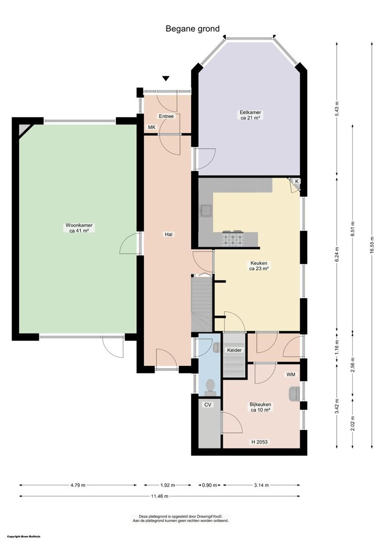 Entree, tochtportaal, gang, rechts van de gang de woonkamer (41m²), links van de gang de eetkamer (21m², werk-/studeerkamer) en de ruime woon-/eetkeuken(23m²) met toegang tot de kelder (10m²) en de bijkeuken (10m²) met wasmachine aansluiting en cv-kast,vernieuwd toilet(vanaf de gang bereikbaar).