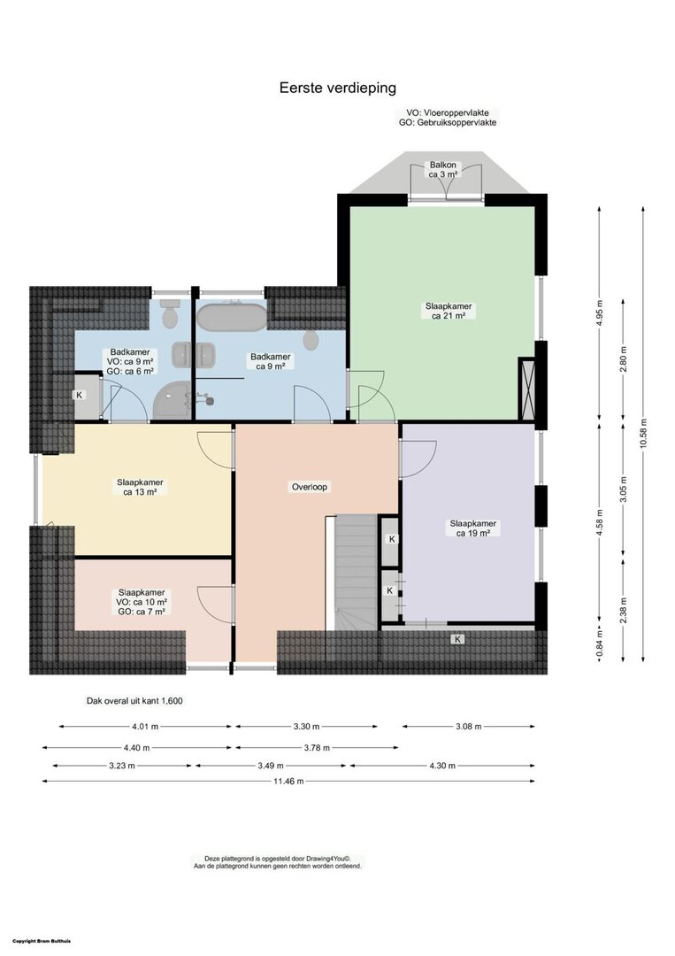 Via de overloop op de eerste verdieping zijn de slaapvertrekken en de eerste badkamer te bereiken. In totaal zijn er vier slaapkamers. De grootste slaapkamer 21m², bevindt zich aan de voorzijde van de woning en beschikt tevens over een balkon. De overige slaapkamers zijn respectievelijk 19m², 13m² en 7m². Er zijn twee recentelijk vernieuwde badkamers, badkamer (1) beschikt over een ligbad, inloopdouche, toilet en wastafel, badkamer (2) beschikt over een douchecabine, wastafel en toilet. Via een vlizotrap op de overloop is een ruime zolder te bereiken.