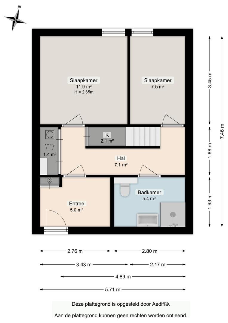 overloop met daaraan twee slaapkamers van respectievelijk circa 8 m² en 12 m², beide gelegen op de koele noordkant. De badkamer is circa 5 m² en voorzien van inloopdouche, wastafelmeubel en 2e toilet. In de wasruimte vindt je aansluitingen voor wasmachine en droger. Praktische bergruimte met meterkast biedt toegang tot de eigen carport met laadpaal.