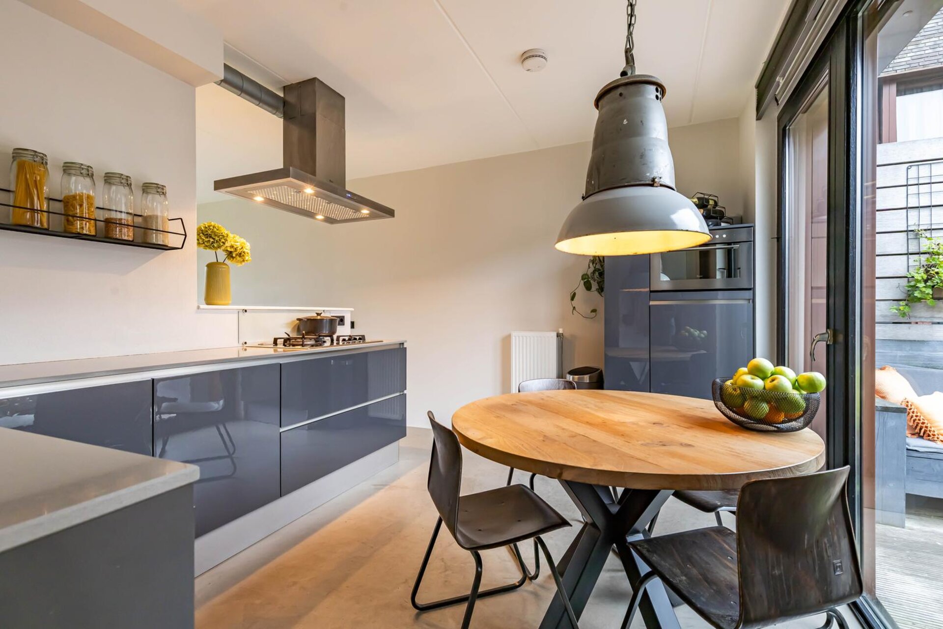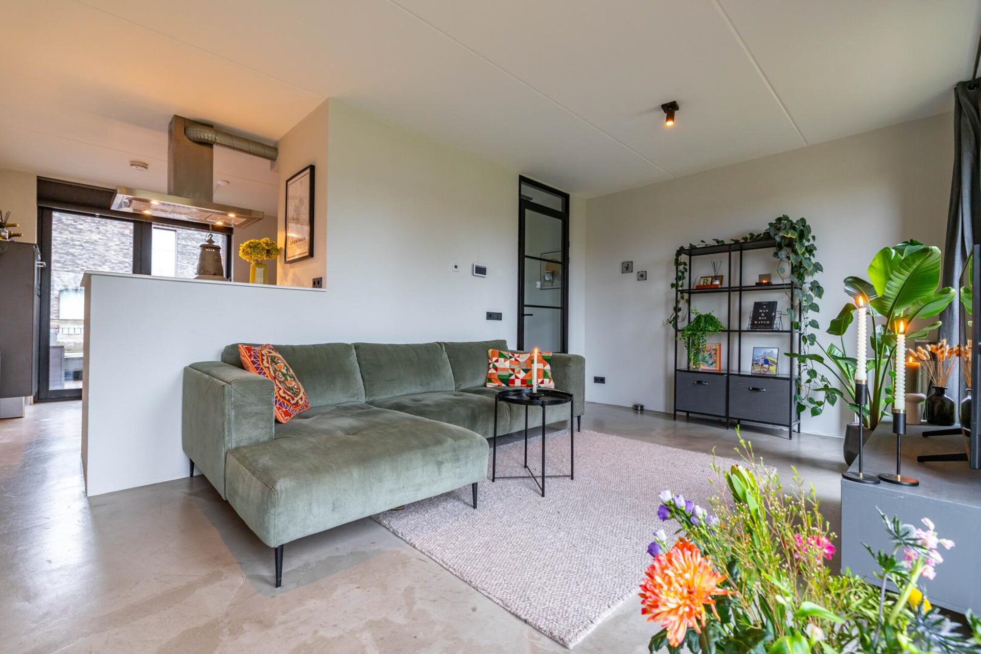 Entree/hal met garderobe en stook- en opbergruimte. Lichte en royale woonkamer van circa 32 m² met moderne open keuken voorzien van diverse inbouwapparatuur zoals een 4-pits gaskookplaat, afzuigkap, koelkast en combi-oven. De keuken biedt via openslaande deuren toegang tot het terras (circa 18 m²) op het zuiden. De sfeervolle woonkamer biedt vrij uitzicht over groen. Halletje met trapopgang naar beneden en toilet voorzien van wandcloset en fonteintje.