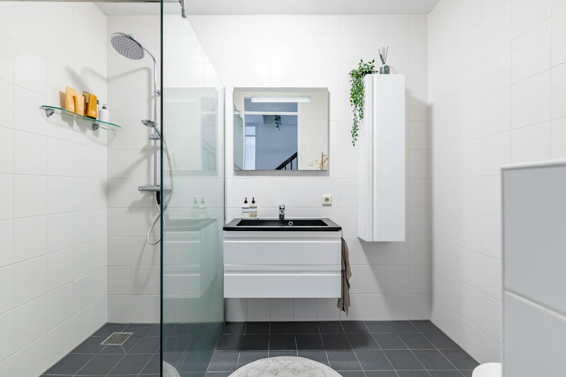 overloop met daaraan twee slaapkamers van respectievelijk circa 8 m² en 12 m², beide gelegen op de koele noordkant. De badkamer is circa 5 m² en voorzien van inloopdouche, wastafelmeubel en 2e toilet. In de wasruimte vindt je aansluitingen voor wasmachine en droger. Praktische bergruimte met meterkast biedt toegang tot de eigen carport met laadpaal.