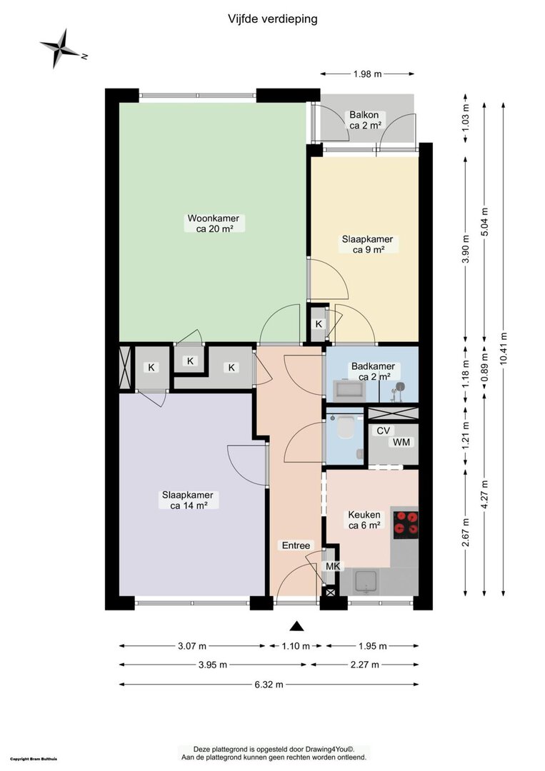 entree/hal met meterkast en toilet voorzien van wandcloset en fonteintje. Ruime en lichte woonkamer van ca. 20 m² met vaste kast en toegang tot het balkon op het zuiden! Slaapkamer van 9 m² met vaste kast, toegang tot het balkon en de moderne badkamer. De badkamer is volledig betegeld en voorzien van inloopdouche en wastafelmeubel. De grote slaapkamer van 14 m², tevens met een vaste kast, ligt aan de voorzijde van het appartement. De moderne keuken is geplaatst in hoekopstelling, voorzien van veel opbergruimte.