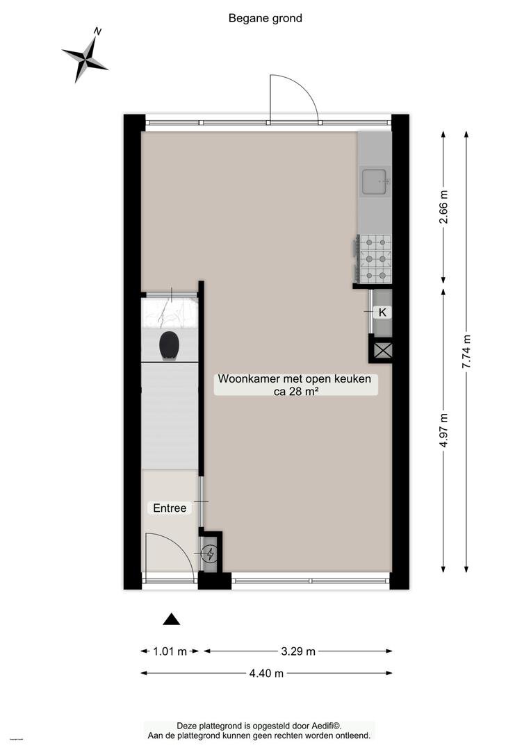 Lichte woonkamer circa 28 m² met laminaatvloer en open keuken met nette keukeninrichting met 5-pits gasfornuis/oven. Toilet met wandcloset. Vanuit de keuken een deur naar de tuin.