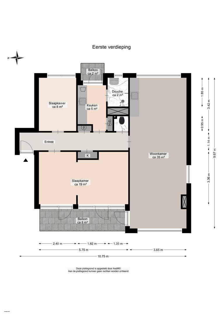 Entree/hal, toilet, eenvoudige keuken met wasmachine-aansluiting en toegang tot de badkamer en klein balkon (2 m²), mede door de hoekligging een lichte royale woonkamer van 35 m² voorzien van tweede keuken en afzuigkap. De eerste slaapkamer grenst aan de keuken en is 8 m² groot. De tweede slaapkamer is 19 m² groot en eenvoudig weer op te delen in 2 kamers, daarnaast biedt deze kamer toegang tot een groot balkon van 8 m², dit balkon is tevens via de woonkamer te bereiken.