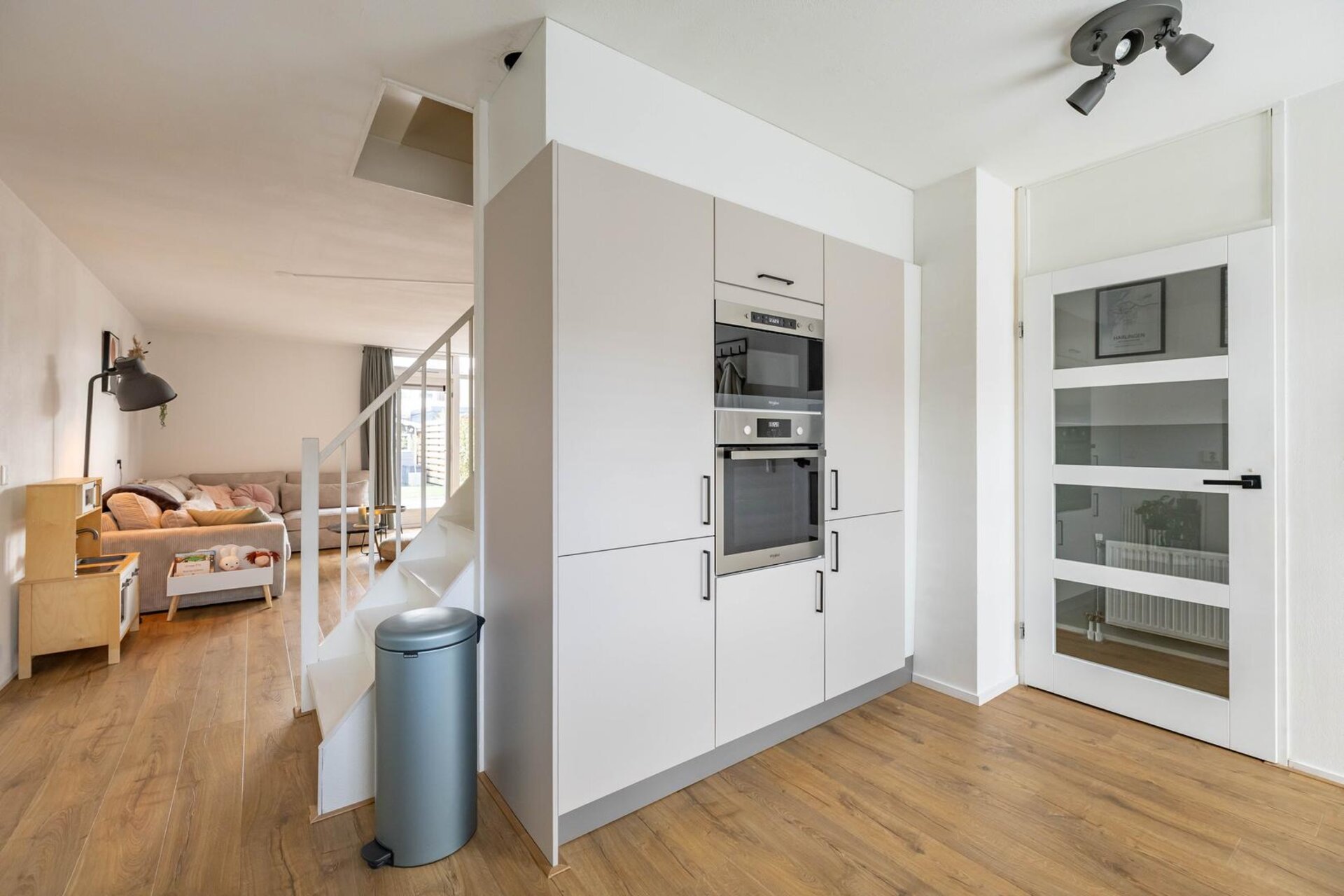 Entree/hal met meterkast en modern toilet voorzien van wandcloset en fonteintje. De royale en lichte woonkamer aan de achterzijde biedt toegang tot de tuin. Aan de voorzijde vind je de open keuken (2022), geplaatst in hoekopstelling met diverse inbouwapparatuur zoals een inductieplaat met afzuiging, vaatwasser, oven, magnetron en koel-/vriescombinatie. Via een trapopgang in de woonkamer bereik je de eerste verdieping.