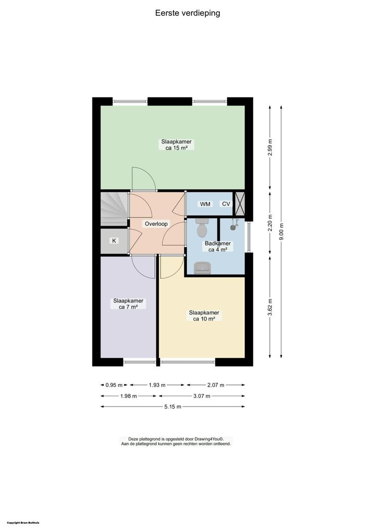 overloop met daaraan drie slaapkamers van 7, 10 en 15 m² groot, moderne badkamer met inloopdouche, wastafel en 2e toilet, de wasruimte met aansluiting voor de wasmachine en opstelling cv-ketel is separaat evenals een ruime opbergkast.