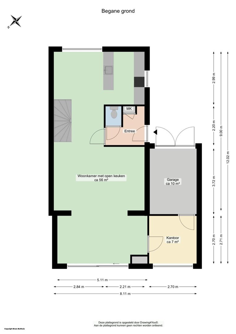 entree/hal met meterkast en toilet voorzien van wandcloset, aan de voorzijde een moderne woonkeuken met schiereiland voorzien van diverse inbouwapparatuur, aan de achterzijde een ruime woonkamer met uitbouw en schuifpui naar de tuin. Aan de achterzijde van de woning bevindt zich tevens een werk-/hobbykamer, de voormalige garage, nu berging is zowel binnen- als buitendoor te bereiken.