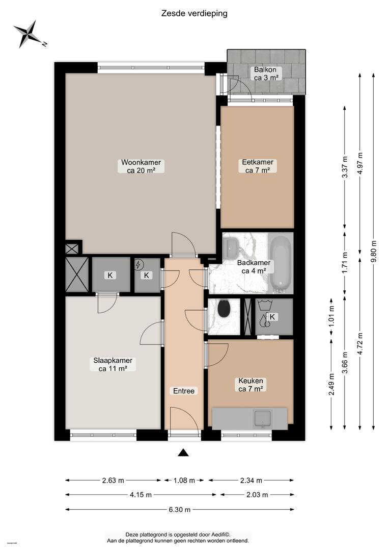 entree/hal, toilet, nette keuken geplaatst in rechte opstelling en voorzien van inloopkast met wasmachine-aansluiting, lichte woonkamer van 20 m² voorzien van laminaatvloer en balkon aan de voorzijde op het zuidwesten met een prachtig uitzicht over de stad. De eerste slaapkamer grenst aan de woonkamer en is 7 m² groot. De 2e slaapkamer is 11 m² en voorzien van inbouwkast. De badkamer met ligbad en vaste wastafel.
