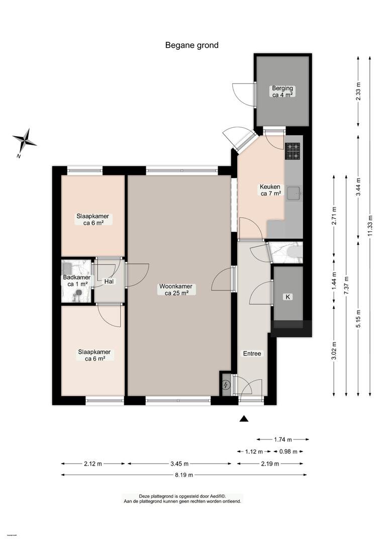Entree/hal, toilet, lichte woonkamer van ca. 25 m² met half open keuken. Nette keuken geplaatst in hoekopstelling is voorzien van diverse inbouwapparatuur en C.V.-opstelling. Vanuit de keuken is er toegang tot de tuin op het zuiden. Beide slaapkamers zijn ca. 6 m² en grenzen aan de woonkamer. De badkamer is voorzien van een douche en een wastafel.