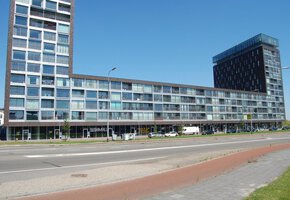 Centrale portiek met lift en trapopgang. Appartement op 1ste etage. Entree met hal en toegang tot slaapkamer aan de achterzijde (circa 7m²), badkamer met douche en toilet, woonkamer met open keuken (circa 18m²) voorzien van inbouwapparatuur (vaatwasser, gaskookplaat, afzuigkap, koelkast, combi-oven).