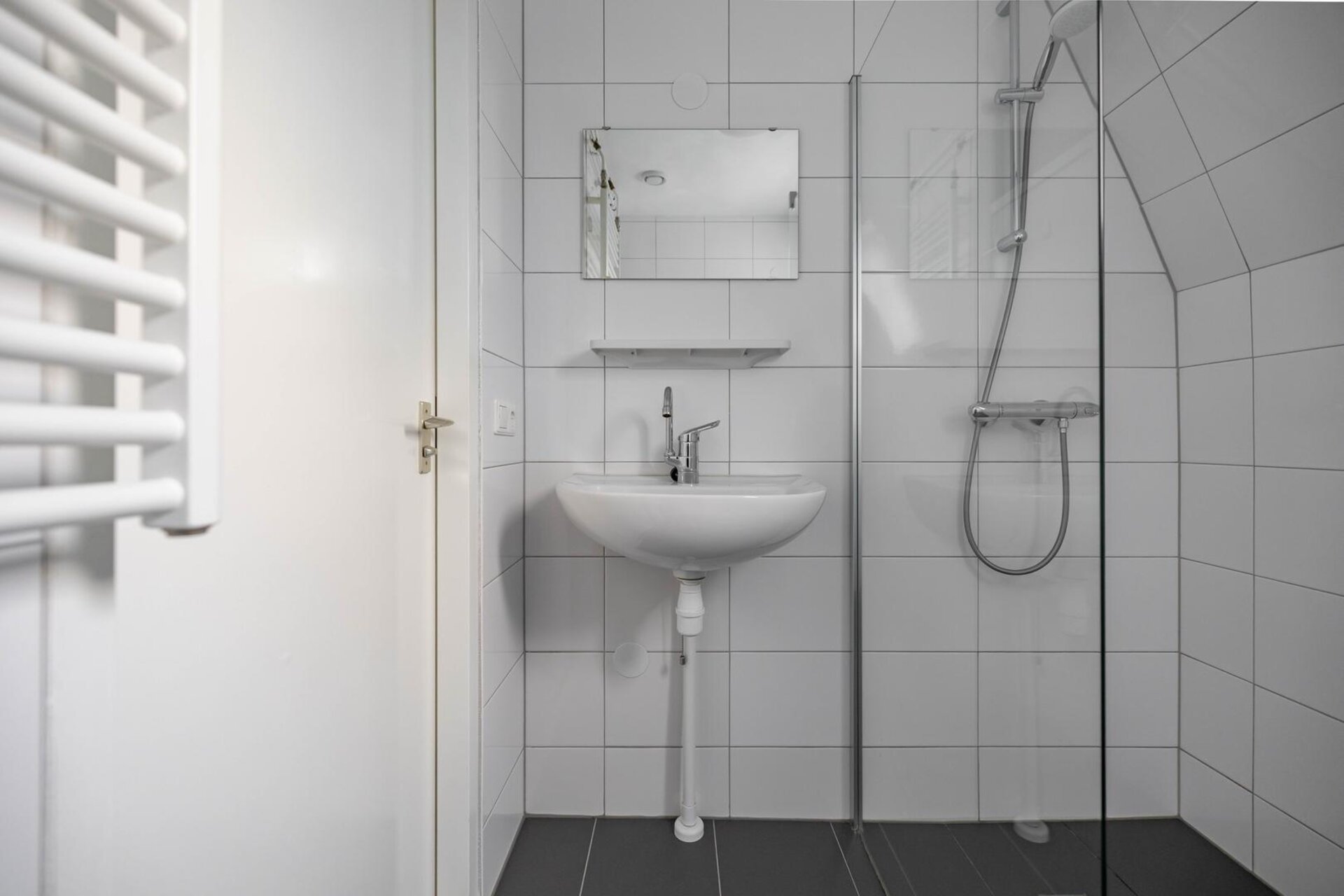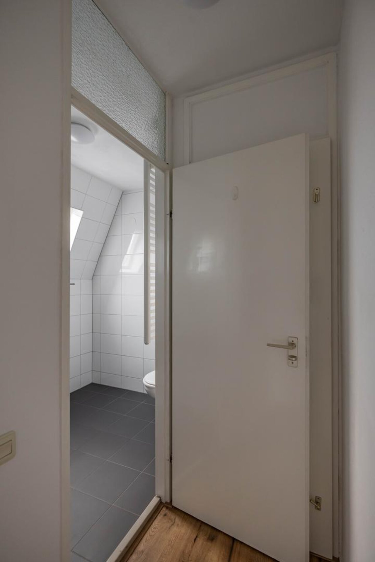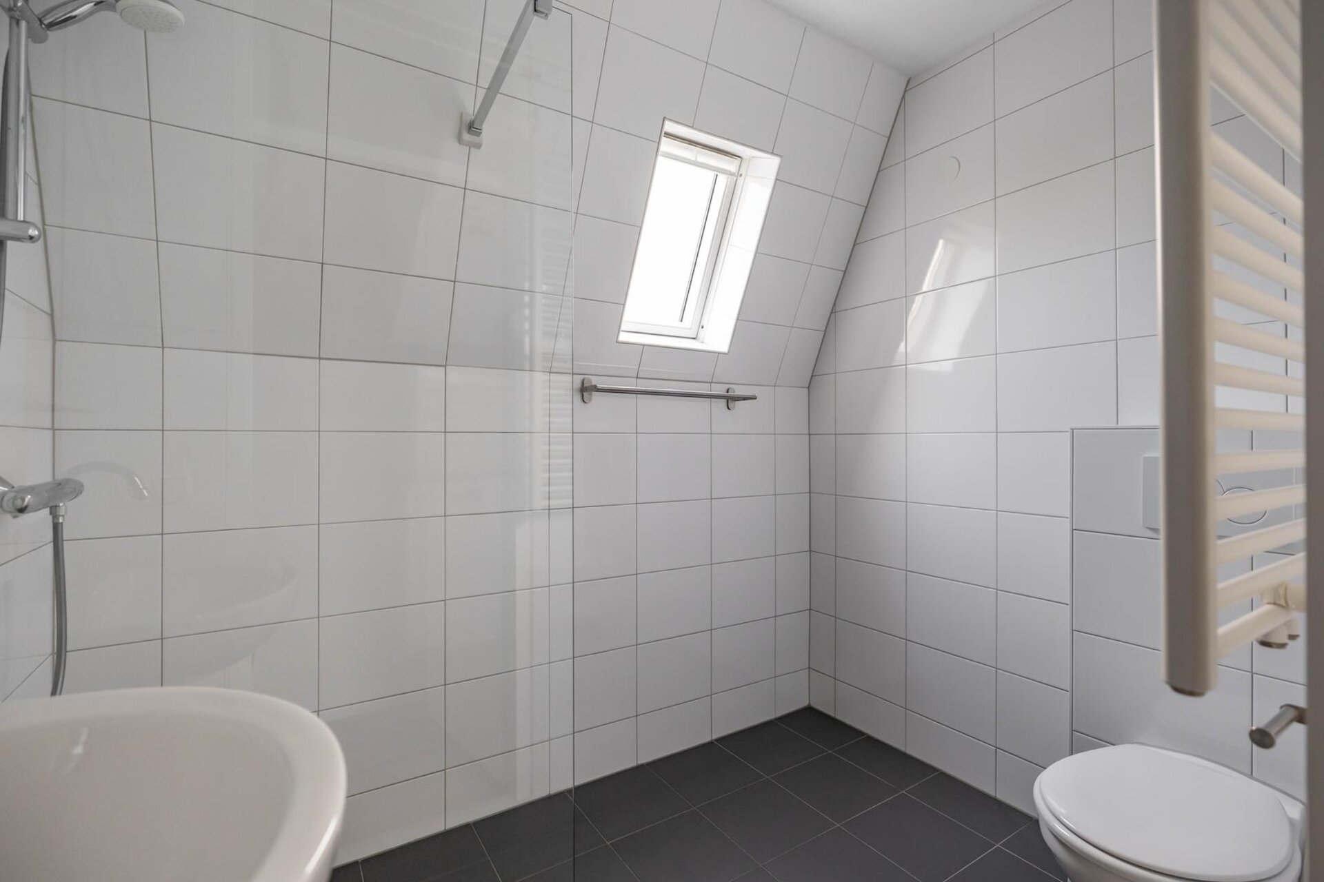 Vernieuwde moderne badkamer voorzien van inloopdouche, toilet(hangend closet), inloopdouche, wastafel, wasmachineaansluiting en een tuimelraam voor lichtinval en extra ventilatie.