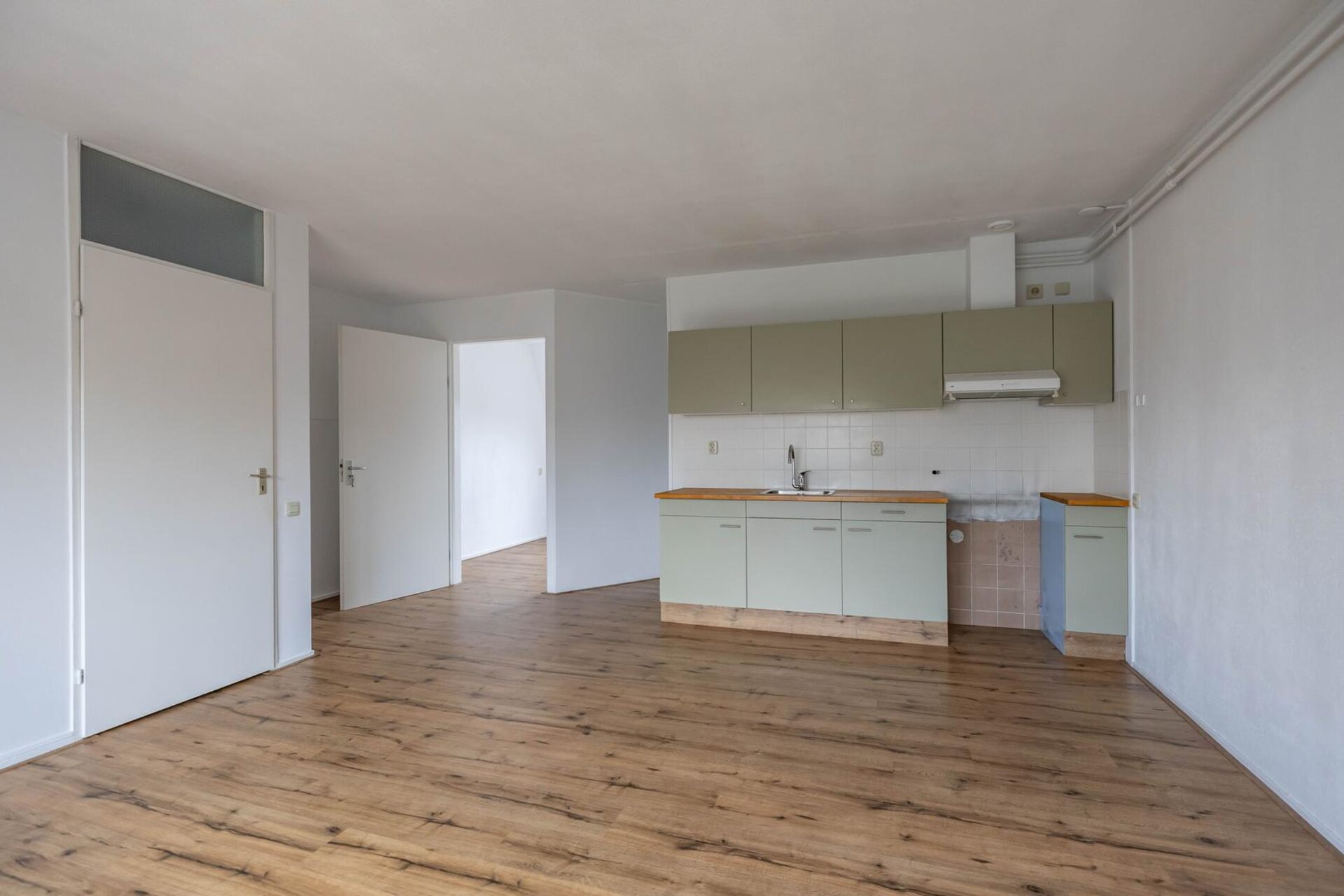 Royale lichte woonkamer met met open keuken met eenvoudige keukeninrichting.