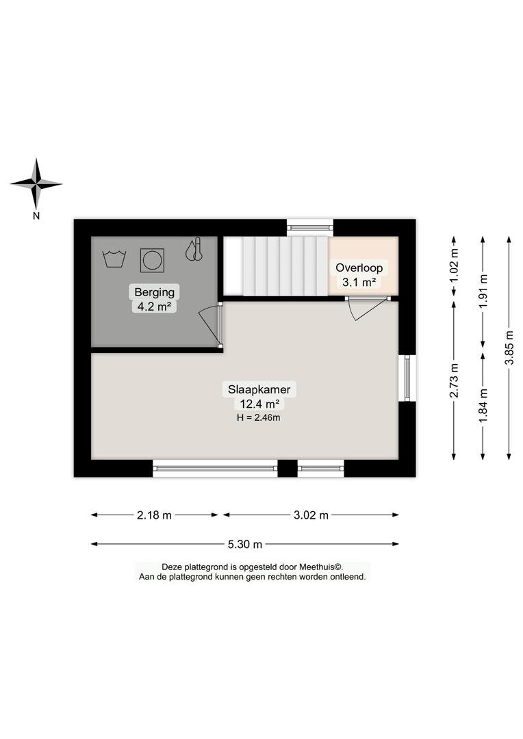Overloop - slaapkamer (12m²), berging (4m²) annex stook- en wasruimte met wasmachine aansluiting en opstelling cv-ketel.