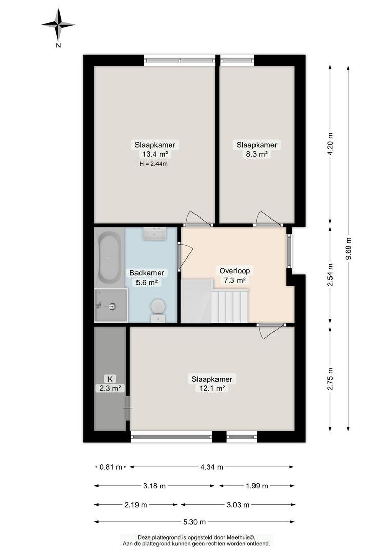 Overloop - 3 slaapkamers (14, 13 en 8m²) - ruime badkamer met inloopdouche, ligbad, wastafel en 2e toilet.