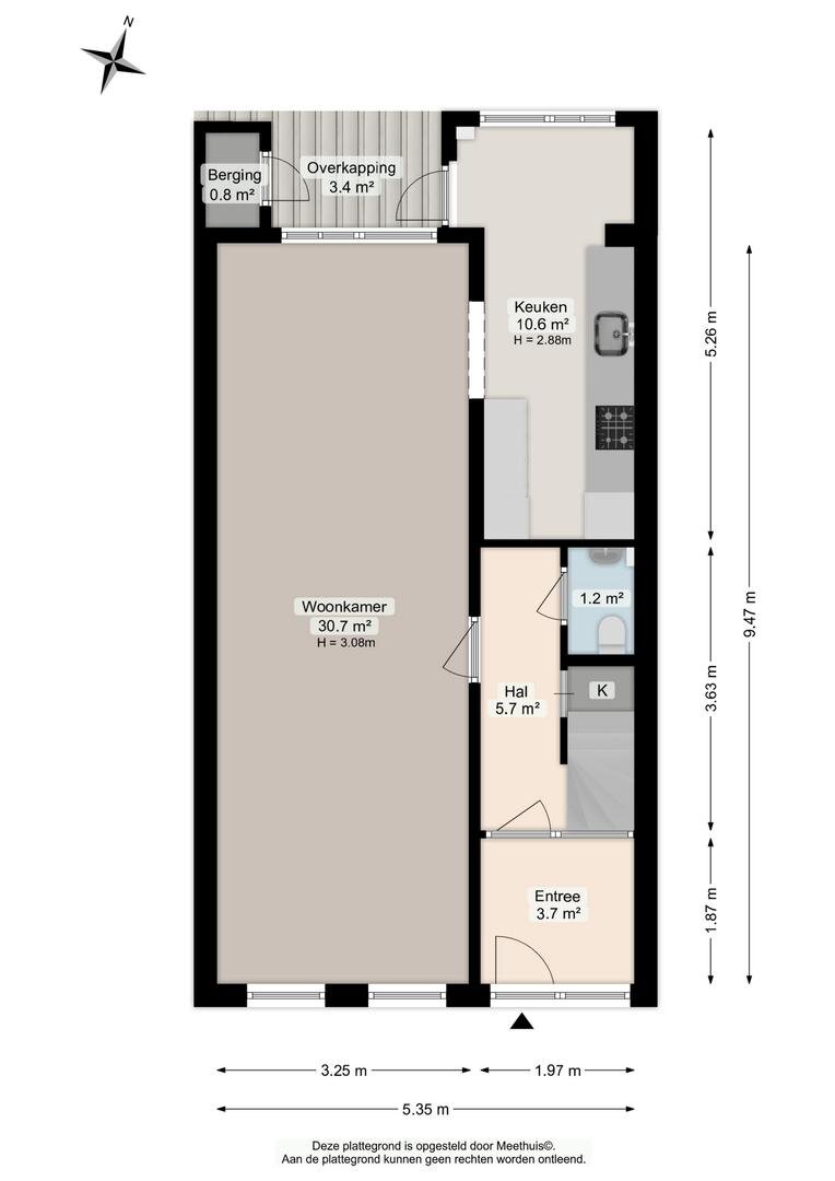 Entree - tochtportaal - hal - toilet met hangcloset, fonteintje en mechanische ventilatie - sfeervolle lichte woonkamer met hoog plafond en halfopen keuken voorzien van nette keukeninrichting met diverse inbouwapparatuur (o.a. vaatwasser, koelkast, vriezer, oven, 4-pits gaskookplaat en afzuigkap). Vanuit de keuken toegang tot de achtertuin.
