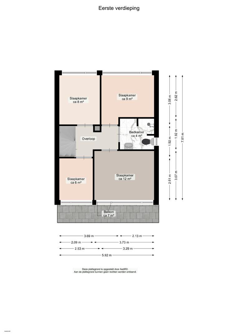 De overloop biedt toegang tot vier slaapkamers van respectievelijk circa 6, 7, 9 en 11 m², de grootste slaapkamer biedt toegang tot een balkon van circa 6 m². Nette badkamer voorzien van inloopdouche, wastafel, handdoekradiator en tweede toilet.